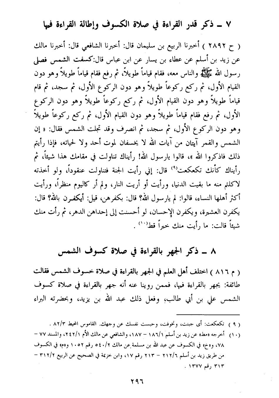 2892 - أَخْبَرَنَا الرَّبِيعُ بْنُ سُلَيْمَانَ، قَالَ: أَخْبَرَنَا الشَّافِعِيُّ، قَالَ: أَخْبَرَنَا مَالِكٌ، عَنْ زَيْدِ بْنِ أَسْلَمَ، عَنْ عَطَاءِ بْنِ يَسَارٍ، عَنِ ابْنِ عَبَّاسٍ، قَالَ: كَسَفَتِ الشَّمْسُ , فَصَلَّى رَسُولُ اللهِ صَلَّى اللَّهُ عَلَيْهِ وَسَلَّمَ وَالنَّاسُ مَعَهُ، فَقَامَ قِيَامًا طَوِيلًا، ثُمَّ رَفَعَ فَقَامَ قِيَامًا طَوِيلًا وَهُوَ دُونَ الْقِيَامِ الْأَوَّلِ، ثُمَّ رَكَعَ رُكُوعًا طَوِيلًا , وَهُوَ دُونَ الرُّكُوعِ الْأَوَّلِ، ثُمَّ سَجَدَ، ثُمَّ قَامَ قِيَامًا طَوِيلًا , وَهُوَ دُونَ الْقِيَامِ الْأَوَّلِ، ثُمَّ رَكَعَ رُكُوعًا طَوِيلًا، وَهُوَ دُونَ الرُّكُوعِ الْأَوَّلِ، ثُمَّ رَفَعَ فَقَامَ قِيَامًا طَوِيلًا وَهُوَ دُونَ الْقِيَامِ الْأَوَّلِ، ثُمَّ رَكَعَ رُكُوعًا طَوِيلًا، وَهُوَ دُونَ الرُّكُوعِ الْأَوَّلِ، ثُمَّ سَجَدَ، ثُمَّ انْصَرَفَ وَقَدْ تَجَلَّتِ الشَّمْسُ , فَقَالَ: «إِنَّ الشَّمْسَ وَالْقَمَرَ آيَتَانِ مِنْ آيَاتِ اللهِ , لَا يَخْسِفَانِ لِمَوْتِ أَحَدٍ وَلَا لِحَيَاتِهِ، فَإِذَا رَأَيْتُمْ ذَلِكَ فَاذْكُرُوا اللهَ» ، قَالُوا يَا رَسُولَ اللهِ رَأَيْنَاكَ تَنَاوَلْتَ فِي مَقَامِكَ هَذَا شَيْئًا , ثُمَّ رَأَيْنَاكَ كَأَنَّكَ تَكَعْكَعْتَ قَالَ: " إِنِّي رَأَيْتُ الْجَنَّةَ , فَتَنَاوَلْتُ عُنْقُودًا، وَلَوْ أَخَذْتُهُ لَأَكَلْتُمْ مِنْهُ مَا بَقِيَتِ الدُّنْيَا، وَرَأَيْتُ، أَوْ، أُرِيتُ النَّارَ، وَلَمْ أَرَ كَالْيَوْمِ مَنْظَرًا، وَرَأَيْتُ أَكْثَرَ أَهْلِهَا النِّسَاءَ، قَالُوا: لِمَ يَا رَسُولَ اللهِ؟ قَالَ: بِكُفْرِهِنَّ، قِيلَ: أَيَكْفُرْنَ بِاللهِ؟ قَالَ: " يَكْفُرْنَ الْعَشِيرَةِ، وَيَكْفُرْنَ الْإِحْسَانَ، لَوْ أَحْسَنْتَ إِلَى إِحْدَاهُنَّ الدَّهْرَ، ثُمَّ رَأَتْ مِنْكَ شَيْئًا قَالَتْ: مَا رَأَيْتُ مِنْكَ خَيْرًا قَطُّ "