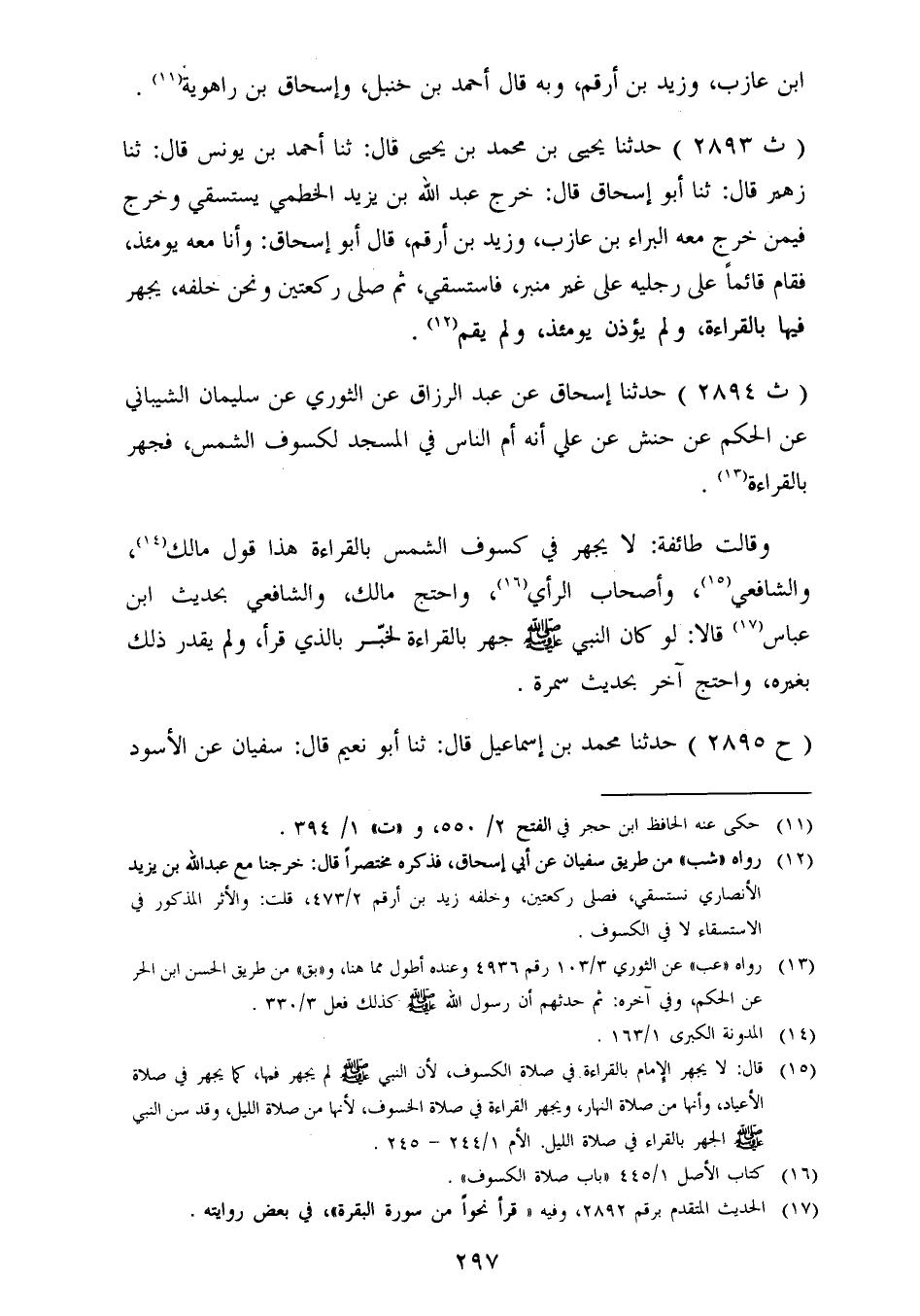 2894 - حَدَّثَنَا إِسْحَاقُ، عَنْ عَبْدِ الرَّزَّاقِ، عَنِ الثَّوْرِيِّ، عَنْ سُلَيْمَانَ الشَّيْبَانِيِّ، عَنِ الْحَكَمِ، عَنْ حَنَشٍ، عَنْ عَلِيٍّ، أَنَّهُ أَمَّ النَّاسَ فِي الْمَسْجِدِ لِكُسُوفِ الشَّمْسِ، فَجَهَرَ بِالْقِرَاءَةِ " وَقَالَتْ طَائِفَةٌ: لَا يُجْهَرُ فِي كُسُوفِ الشَّمْسِ بِالْقِرَاءَةِ: هَذَا قَوْلُ مَالِكٍ، وَالشَّافِعِيِّ، وَأَصْحَابِ الرَّأْيِ، وَاحْتَجَّ مَالِكٌ، وَالشَّافِعِيُّ بِحَدِيثِ ابْنِ عَبَّاسٍ , قَالَا: لَوْ كَانَ النَّبِيُّ صَلَّى اللَّهُ عَلَيْهِ وَسَلَّمَ جَهَرَ بِالْقِرَاءَةِ لَخَبَّرَ بِالَّذِي قَرَأَ، وَلَمْ يُقَدِّرْ ذَلِكَ بِغَيْرِهِ، وَاحْتَجَّ آخِرُ بِحَدِيثِ سَمُرَةَ