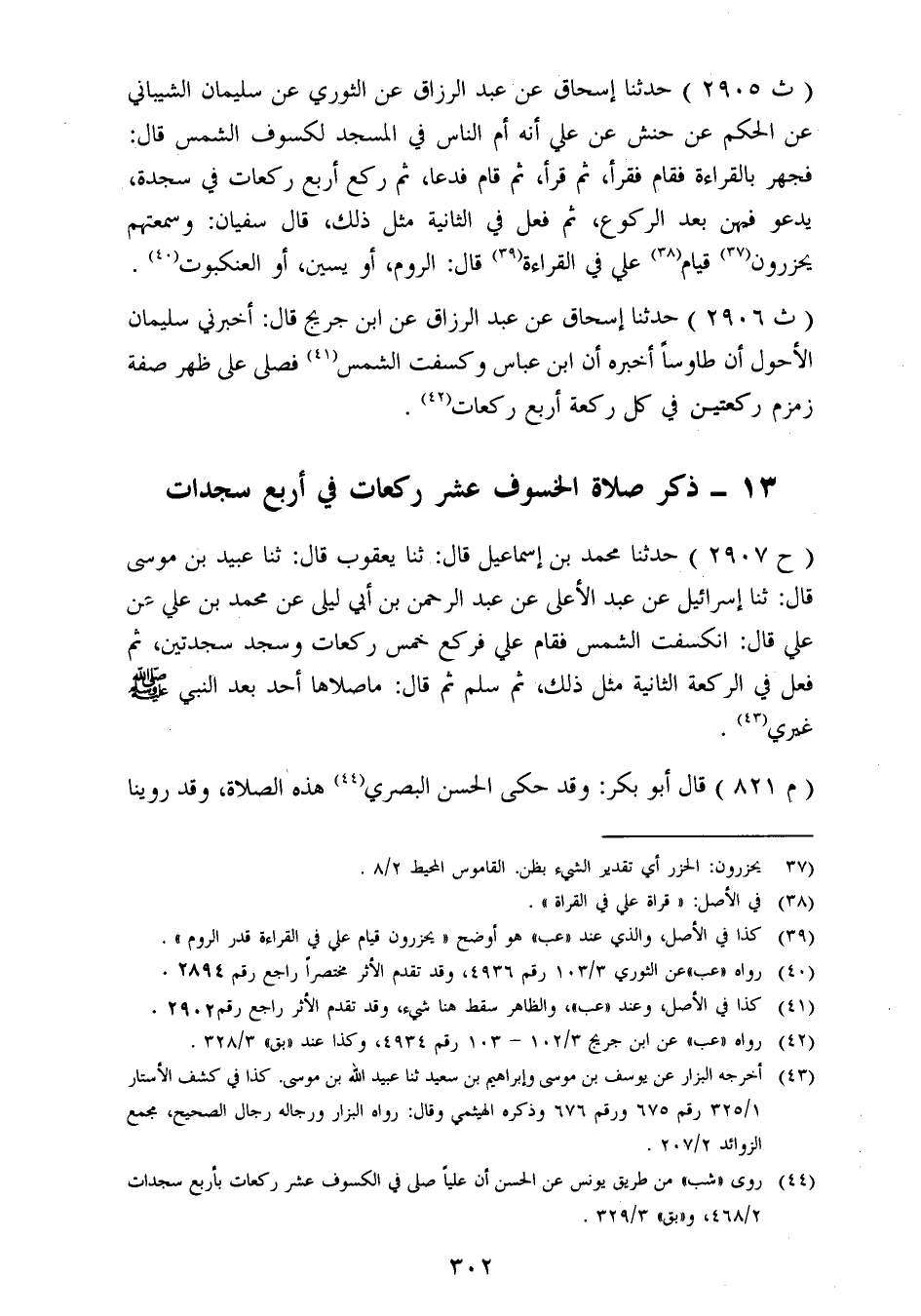2905 - حَدَّثَنَا إِسْحَاقُ، عَنْ عَبْدِ الرَّزَّاقِ، عَنِ الثَّوْرِيِّ، عَنْ سُلَيْمَانَ الشَّيْبَانِيِّ، عَنِ الْحَكَمِ، عَنْ حَنَشٍ، عَنْ عَلِيٍّ، أَنَّهُ أَمَّ النَّاسَ فِي الْمَسْجِدِ لِكُسُوفِ الشَّمْسِ قَالَ: فَجَهَرَ بِالْقِرَاءَةِ فَقَامَ فَقَرَأَ، ثُمَّ قَرَأَ، ثُمَّ قَامَ فَدَعَا، ثُمَّ رَكَعَ أَرْبَعَ رَكَعَاتٍ فِي سَجْدَةٍ يَدْعُو فِيهِنَّ بَعْدَ الرُّكُوعِ، ثُمَّ فَعَلَ فِي الثَّانِيَةِ مِثْلَ ذَلِكَ قَالَ سُفْيَانُ: وَسَمِعْتُهُمْ يَحْزِرُونَ قِيَامَ عَلِيٍّ فِي الْقِرَاءَةِ قَالَ: الرُّومُ، أَوْ يس، أَوِ الْعَنْكَبُوتُ "