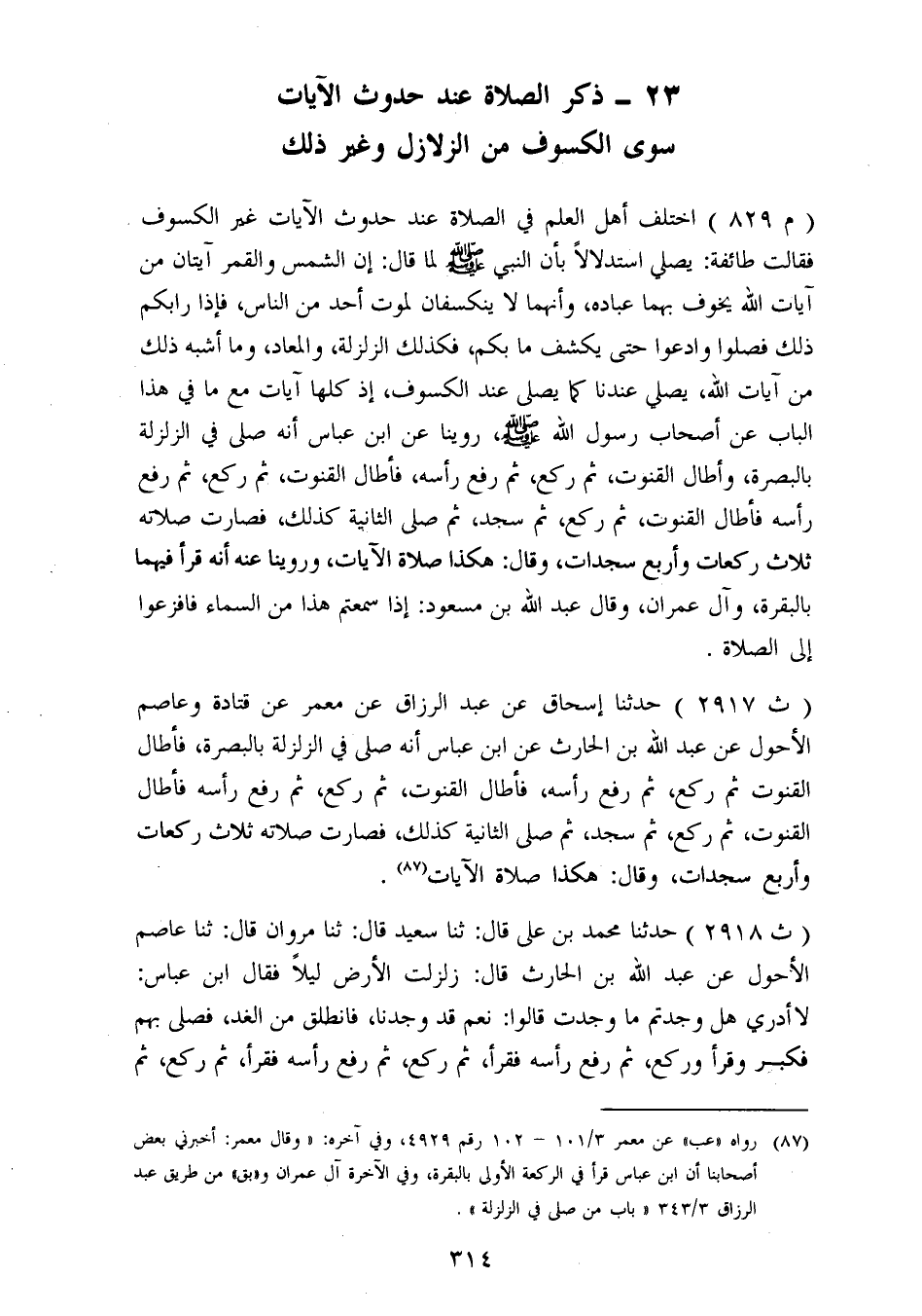ذِكْرُ الصَّلَاةِ عِنْدَ حُدُوثِ الْآيَاتِ سِوَى الْكُسُوفِ مِنَ الزَّلَازِلِ وَغَيْرِ ذَلِكَ اخْتَلَفَ أَهْلُ الْعِلْمِ فِي الصَّلَاةِ عِنْدَ حُدُوثِ الْآيَاتِ غَيْرِ الْكُسُوفِ فَقَالَتْ طَائِفَةٌ: يُصَلَّى اسْتِدْلَالًا بِأَنَّ النَّبِيَّ صَلَّى اللَّهُ عَلَيْهِ وَسَلَّمَ لَمَّا قَالَ: «إِنَّ الشَّمْسَ وَالْقَمَرَ آيَتَانِ مِنْ آيَاتِ اللهِ يُخَوِّفُ بِهِمَا عِبَادَهُ، وَأَنَّهُمَا لَا يَنْكَسِفَانِ لِمَوْتِ أَحَدٍ مِنَ النَّاسِ، فَإِذَا رَابَكُمْ ذَلِكَ فَصَلُّوا وَادْعُوا حَتَّى يَكْشِفَ مَا بِكُمْ» ، فَكَذَلِكَ الزَّلْزَلَةُ، وَالْمَعَادُ، وَمَا أَشْبَهَ ذَلِكَ مِنْ آيَاتِ اللهِ يُصَلَّى عِنْدَهَا كَمَا يُصَلَّى عِنْدَ الْكُسُوفِ إِذْ كُلُّهَا آيَاتٌ مَعَ مَا فِي هَذَا الْبَابِ عَنْ أَصْحَابِ رَسُولِ اللهِ صَلَّى اللَّهُ عَلَيْهِ وَسَلَّمَ، رُوِّينَا عَنِ ابْنِ عَبَّاسٍ أَنَّهُ صَلَّى فِي الزَّلْزَلَةِ بِالْبَصْرَةِ، وَأَطَالَ الْقُنُوتَ، ثُمَّ رَكَعَ، ثُمَّ رَفَعَ رَأْسَهُ، فَأَطَالَ الْقُنُوتَ، ثُمَّ رَكَعَ، ثُمَّ رَفَعَ رَأْسَهُ فَأَطَالَ الْقُنُوتَ، ثُمَّ رَكَعَ، ثُمَّ سَجَدَ، ثُمَّ صَلَّى الثَّانِيَةَ كَذَلِكَ، فَصَارَتْ صَلَاتُهُ ثَلَاثَ رَكَعَاتٍ وَأَرْبَعَ سَجَدَاتٍ، وَقَالَ: هَكَذَا صَلَاةُ الْآيَاتِ، وَرُوِّينَا عَنْهُ أَنَّهُ قَرَأَ فِيهِمَا بِالْبَقَرَةِ، وَآلِ عِمْرَانَ، وَقَالَ عَبْدُ اللهِ بْنُ مَسْعُودٍ: إِذَا سَمِعْتُمْ هَذَا مِنَ السَّمَاءِ فَافْزَعُوا إِلَى الصَّلَاةِ