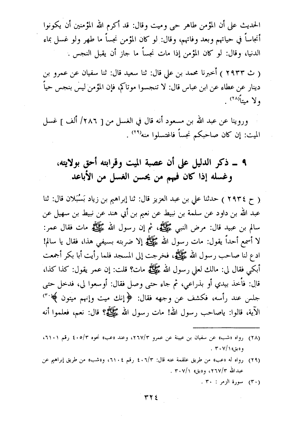 2933 - أَخْبَرَنَا مُحَمَّدُ بْنُ عَلِيٍّ، قَالَ: ثنا سَعِيدٌ، قَالَ: ثنا سُفْيَانُ، عَنْ عَمْرِو بْنِ دِينَارٍ، عَنْ عَطَاءٍ، عَنِ ابْنِ عَبَّاسٍ، قَالَ: «لَا تُنَجِّسُوا مَوْتَاكُمْ، فَإِنَّ الْمُؤْمِنَ لَيْسَ بِنَجَسٍ حَيًّا وَلَا مَيِّتًا» وَرُوِّينَا عَنْ عَبْدِ اللهِ بْنِ مَسْعُودٍ أَنَّهُ قَالَ فِي الْغُسْلِ مِنْ غُسْلِ الْمَيِّتِ: إِنْ كَانَ صَاحِبُكُمْ نَجِسًا فَاغْتَسِلُوا مِنْهُ