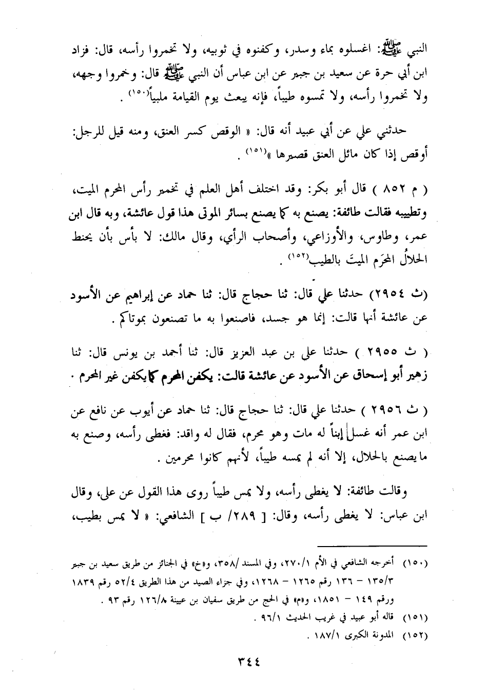 2956 - حَدَّثَنَا عَلِيُّ، قَالَ: ثنا حَجَّاجٌ، قَالَ: ثنا حَمَّادٌ، عَنْ أَيُّوبَ، عَنْ نَافِعٍ، عَنِ ابْنِ عُمَرَ، " أَنَّهُ غَسَلَ ابْنًا لَهُ مَاتَ وَهُوَ مُحْرِمٌ، فَقَالَ لَهُ وَاقِدٌ: فَغَطَّى رَأْسَهُ، وَصَنَعَ بِهِ مَا يُصْنَعُ بِالْحَلَالِ إِلَّا أَنَّهُ لَمْ يُمِسَّهُ طِيبًا، لِأَنَّهُمْ كَانُوا مُحْرِمِينَ " وَقَالَتْ طَائِفَةٌ: لَا يُغَطَّى رَأْسُهُ، وَلَا يُمَسُّ طِيبًا رُوِيَ هَذَا الْقَوْلُ عَنْ عَلِيٍّ وَقَالَ ابْنُ عَبَّاسٍ: «لَا يُغَطَّى رَأْسُهُ» ، وَقَالَ: الشَّافِعِيُّ: لَا يُمَسُّ بِطِيبٍ، -[345]- وَلَا يُخَمَّرُ رَأْسُهُ، وَبِهِ قَالَ أَحْمَدُ، وَإِسْحَاقُ