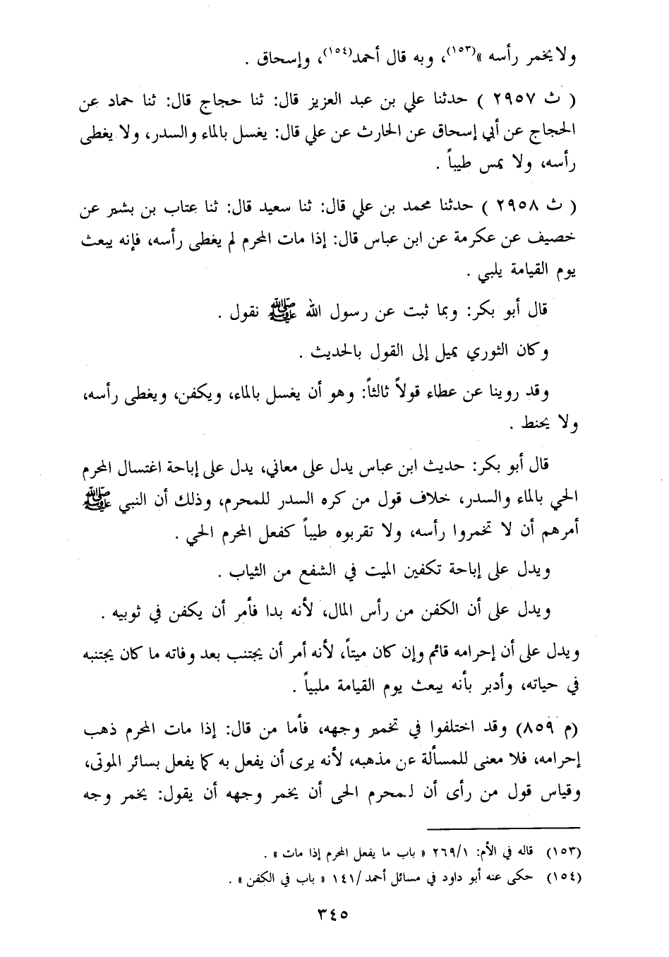 2958 - حَدَّثَنَا مُحَمَّدُ بْنُ عَلِيٍّ، قَالَ: ثنا سَعِيدٌ، قَالَ: ثنا عَتَّابُ بْنُ بَشِيرٍ، عَنْ خُصَيْفٍ، عَنْ عِكْرِمَةَ، عَنِ ابْنِ عَبَّاسٍ، قَالَ: «إِذَا مَاتَ الْمُحْرِمُ لَمْ يُغَطَّ رَأْسُهُ، فَإِنَّهُ يُبْعَثُ يَوْمَ الْقِيَامَةِ يُلَبِّي» قَالَ أَبُو بَكْرٍ: وَبِمَا ثَبَتَ عَنْ رَسُولِ اللهِ صَلَّى اللَّهُ عَلَيْهِ وَسَلَّمَ نَقُولُ، وَكَانَ الثَّوْرِيُّ يَمِيلُ إِلَى الْقَوْلِ بِالْحَدِيثِ، وَقَدْ رُوِّينَا عَنْ عَطَاءٍ قَوْلًا ثَالِثًا: وَهُوَ أَنْ يُغْسَلَ بِالْمَاءِ، وَيُكَفَّنُ، وَيُغَطَّى رَأْسُهُ، وَلَا يُحَنَّطُ قَالَ أَبُو بَكْرٍ: حَدِيثُ ابْنُ عَبَّاسٍ يَدُلُّ عَلَى مَعَانِيَ: يَدُلُّ عَلَى إِبَاحَةِ اغْتِسَالِ الْمُحْرِمِ الْحَيِّ بِالْمَاءِ وَالسِّدْرِ خِلَافَ قَوْلِ مَنْ كَرِهَ السِّدْرَ لِلْمُحْرِمِ، وَذَلِكَ أَنَّ النَّبِيَّ صَلَّى اللَّهُ عَلَيْهِ وَسَلَّمَ أَمَرَهُمْ: «أَنْ لَا تُخَمِّرُوا رَأْسَهُ، وَلَا تُقَرِّبُوهُ طِيبًا كَفِعْلِ الْمُحْرِمِ الْحَيِّ» ، وَيَدُلُّ عَلَى إِبَاحَةِ تَكْفِينِ الْمَيِّتِ فِي الشَّفْعِ مِنَ الثِّيَابِ، وَيَدُلُّ عَلَى أَنَّ الْكَفَنَ مِنْ رَأْسِ الْمَالِ لِأَنَّهُ بَدَأَ فَأَمَرَ أَنْ يُكَفَّنَ فِي ثَوْبَيْهِ، وَيَدُلُّ عَلَى أَنَّ إِحْرَامَهُ قَائِمٌ وَإِنْ كَانَ مَيِّتًا، لِأَنَّهُ أَمَرَ أَنْ يَجْتَنِبَ بَعْدَ وَفَاتِهِ مَا كَانَ يَجْتَنِبُهُ فِي حَيَاتِهِ، وَأَدْبَرَ بِأَنَّهُ يُبْعَثُ يَوْمَ الْقِيَامَةِ مُلَبِّيًا وَقَدِ اخْتَلَفُوا فِي تَخْمِيرِ وَجْهِهِ، فَأَمَّا مَنْ قَالَ: إِذَا مَاتَ الْمُحْرِمُ ذَهَبَ إِحْرَامُهُ، فَلَا مَعْنًى لِلْمَسْأَلَةِ عَنْ مَذْهَبِهِ، لِأَنَّهُ يَرَى أَنْ يُفْعَلَ بِهِ كَمَا يُفْعَلُ بِسَائِرِ الْمَوْتَى، وَقِيَاسُ قَوْلِ مَنْ رَأَى أَنَّ لِلْمُحْرِمِ الْحَيِّ أَنْ يُخَمِّرَ وَجْهَهُ أَنْ يَقُولَ: يُخَمَّرُ وَجْهُ -[346]- الْمُحْرِمِ الْمَيِّتِ، وَمِمَّنْ كَانَ لَا يَرَى بَأْسًا أَنْ يُخَمِّرَ الْمُحْرِمُ وَجْهَهُ سَعْدُ بْنُ أَبِي وَقَّاصٍ، وَجَابِرُ بْنُ عَبْدِ اللهِ، وَالْقَاسِمُ بْنُ مُحَمَّدٍ، وَطَاوُسٌ، وَالثَّوْرِيُّ، وَالشَّافِعِيُّ، وَأَحْمَدُ، وَإِسْحَاقُ، وَأَبُو ثَوْرٍ، وَكَرِهَتْ طَائِفَةٌ مِنْ أَصْحَابِ الْحَدِيثِ أَنْ يُخَمِّرَ الْمُحْرِمُ وَجْهَهُ، وَأَنْ يُخَمَّرَ وَجْهُ الْمُحْرِمِ الْمَيِّتِ، وَاحْتَجَّ بَعْضُهُمْ بِأَحَادِيثَ مِنْهَا مَا