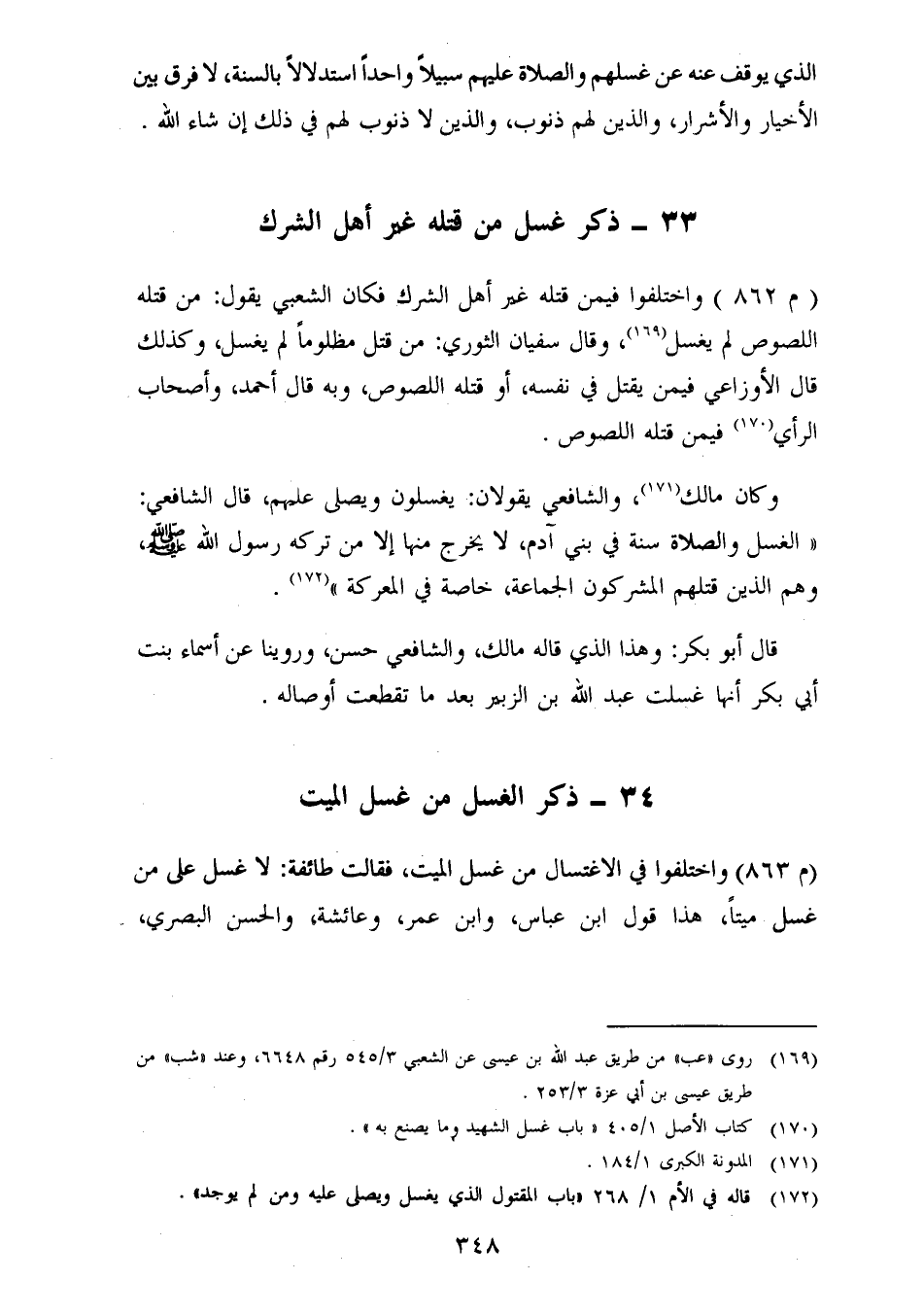 ذِكْرُ غَسْلِ مَنْ قَتَلَهُ غَيْرُ أَهْلِ الشِّرْكِ وَاخْتَلَفُوا فِيمَنْ قَتَلَهُ غَيْرُ أَهْلِ الشِّرْكِ فَكَانَ الشَّعْبِيُّ يَقُولُ: مَنْ قَتَلَهُ اللُّصُوصُ لَمْ يُغْسَلْ، وَقَالَ سُفْيَانُ الثَّوْرِيُّ: «مَنْ قُتِلَ مَظْلُومًا لَمْ يُغْسَلْ» ، وَكَذَلِكَ قَالَ الْأَوْزَاعِيُّ فِيمَنْ يُقْتَلُ فِي نَفْسِهِ، أَوْ قَتَلَهُ اللُّصُوصُ، وَبِهِ قَالَ أَحْمَدُ، وَأَصْحَابُ الرَّأْيِ فِيمَنْ قَتَلَهُ اللُّصُوصُ، وَكَانَ مَالِكٌ وَالشَّافِعِيُّ يَقُولَانِ: يُغْسَلُونَ وَيُصَلَّى عَلَيْهِمْ قَالَ الشَّافِعِيُّ: " الْغُسْلُ وَالصَّلَاةُ سُنَّةٌ فِي بَنَى آدَمَ، لَا يَخْرُجُ مِنْهَا إِلَّا مَنْ تَرَكَهُ رَسُولُ اللهِ صَلَّى اللَّهُ عَلَيْهِ وَسَلَّمَ، وَهُمُ الَّذِينَ قَتَلَهُمُ الْمُشْرِكُونَ الْجَمَاعَةُ خَاصَّةً فِي الْمَعْرَكَةٍ قَالَ أَبُو بَكْرٍ: وَهَذَا الَّذِي قَالَهُ مَالِكٌ، وَالشَّافِعِيُّ حَسَنٌ، وَرُوِّينَا عَنْ أَسْمَاءَ بِنْتِ أَبِي بَكْرٍ أَنَّهَا غَسَلَتْ عَبْدَ اللهِ بْنَ الزُّبَيْرِ بَعْدَمَا تَقَطَّعَتْ أَوْصَالُهُ
