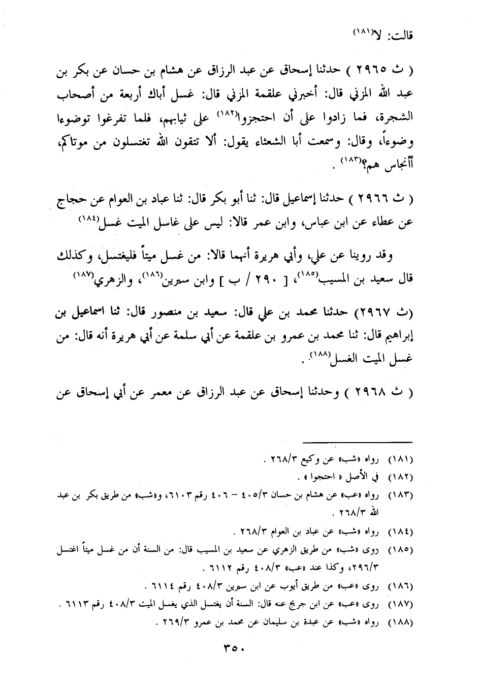 2965 - حَدَّثَنَا إِسْحَاقُ، عَنْ عَبْدِ الرَّزَّاقِ، عَنْ هِشَامِ بْنِ حَسَّانَ، عَنْ بَكْرِ بْنِ عَبْدِ اللهِ الْمُزَنِيِّ، قَالَ: أَخْبَرَنِي عَلْقَمَةُ الْمُزَنِيُّ، قَالَ: «غَسَلَ أَبَاكَ أَرْبَعَةً مِنْ أَصْحَابِ الشَّجَرَةِ، فَمَا زَادُوا عَلَى أَنِ احْتَجَزُوا عَلَى ثِيَابِهِمْ، فَلَمَّا تَفَرَّغُوا تَوَضَّئُوا وُضُوءً»