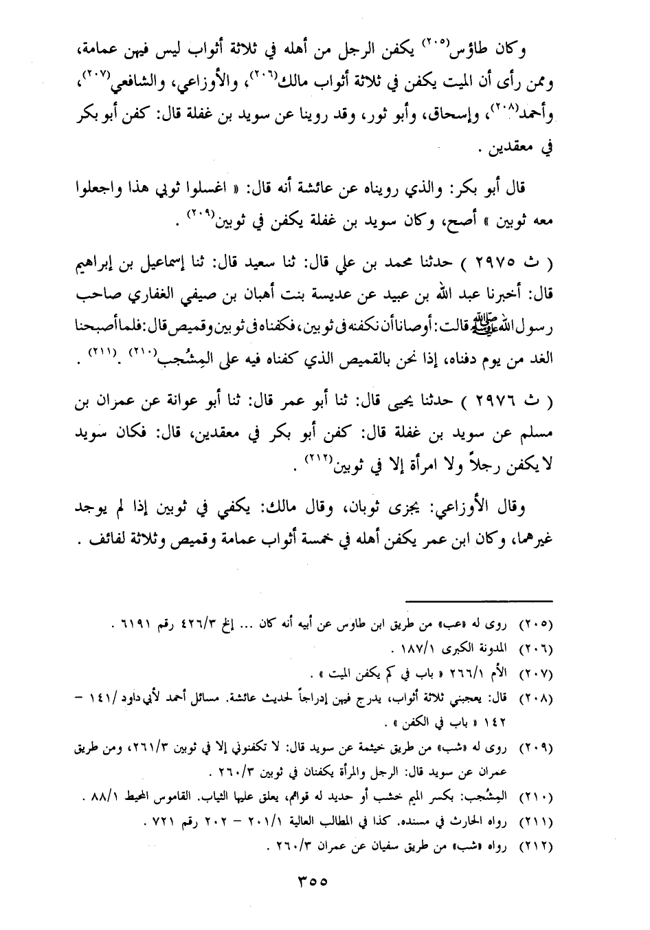 2976 - حَدَّثَنَا يَحْيَى، قَالَ: ثنا أَبُو عُمَرَ، قَالَ: ثنا أَبُو عَوَانَةَ، عَنْ عِمْرَانَ بْنِ مُسْلِمٍ، عَنْ سُوَيْدِ بْنِ غَفَلَةَ، قَالَ: " كُفِّنَ أَبُو بَكْرٍ فِي مِعْقَدَيْنِ قَالَ: فَكَانَ سُوَيْدٌ لَا يُكَفِّنُ رَجُلًا وَلَا امْرَأَةً إِلَّا فِي ثَوْبَيْنِ " وَقَالَ الْأَوْزَاعِيُّ: يُجْزِي ثَوْبَانِ، وَقَالَ مَالِكٌ: يَكْفِي فِي ثَوْبَيْنِ إِذَا لَمْ يُوجَدْ غَيْرُهُمَا، وَكَانَ ابْنُ عُمَرَ يُكَفِّنُ أَهْلَهُ فِي خَمْسَةِ أَثْوَابٍ عِمَامَةٍ وَقَمِيصٍ وَثَلَاثَةِ لَفَائِفَ