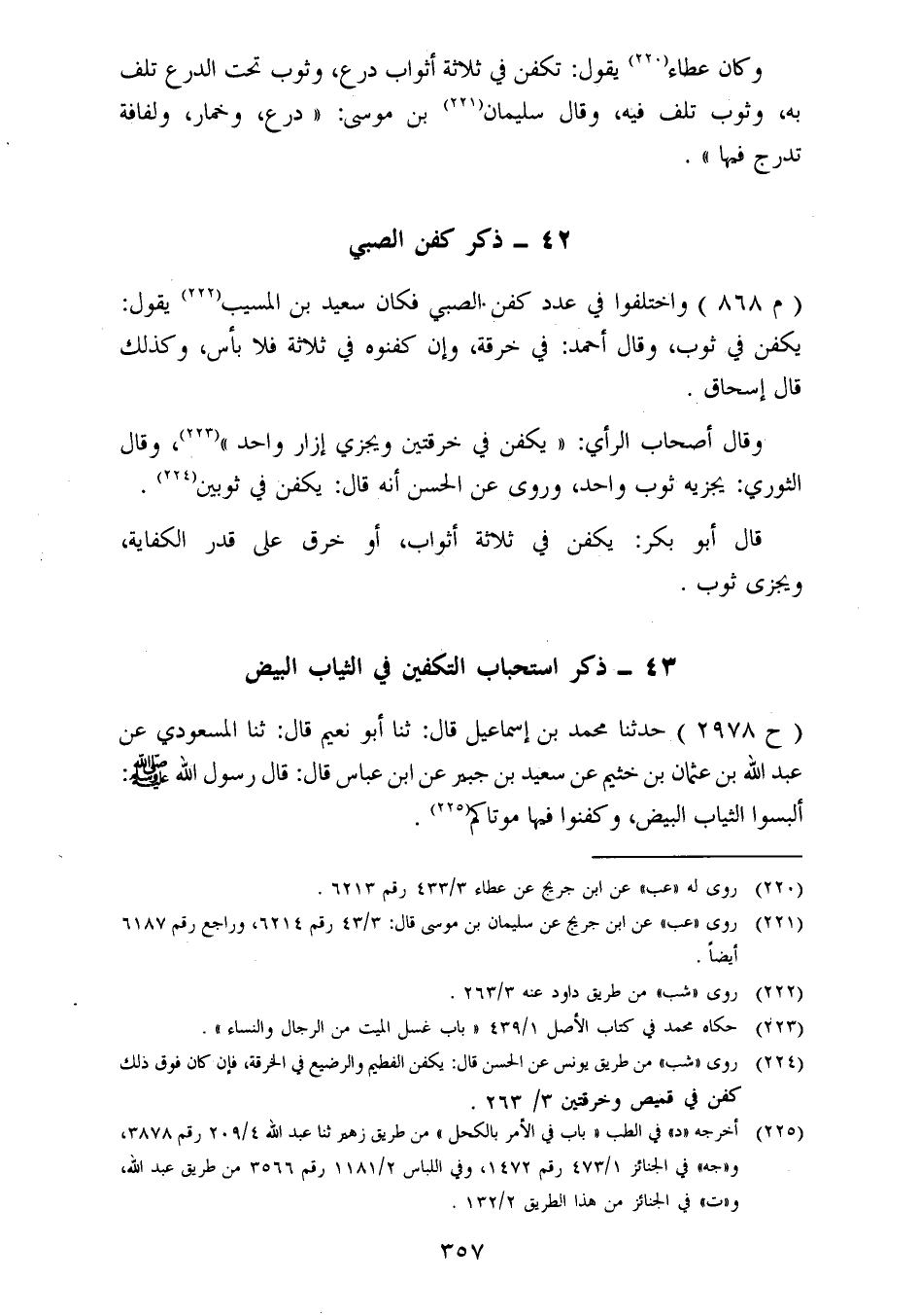 ذِكْرُ كَفَنِ الصَّبِيِّ وَاخْتَلَفُوا فِي عَدَدِ كَفَنِ الصَّبِيِّ فَكَانَ سَعِيدُ بْنُ الْمُسَيِّبِ يَقُولُ: يُكَفَّنُ فِي ثَوْبٍ، وَقَالَ أَحْمَدُ: فِي خِرْقَةٍ، وَإِنْ كَفَّنُوهُ فِي ثَلَاثَةٍ فَلَا بَأْسَ، وَكَذَلِكَ قَالَ إِسْحَاقُ. وَقَالَ أَصْحَابُ الرَّأْيِ: يُكَفَّنُ فِي خِرْقَتَيْنِ وَيُجْزِي إِزَارٌ وَاحِدٌ، وَقَالَ الثَّوْرِيُّ: يُجْزِيهِ ثَوْبٌ وَاحِدٌ، وَرُوِيَ عَنِ الْحَسَنِ أَنَّهُ قَالَ: يُكَفَّنُ فِي ثَوْبَيْنِ قَالَ أَبُو بَكْرٍ: يَكُفَّنُ فِي ثَلَاثَةِ أَثْوَابٍ، أَوْ خِرَقٍ عَلَى قَدْرِ الْكِفَايَةِ، وَيُجْزِي ثَوْبٌ