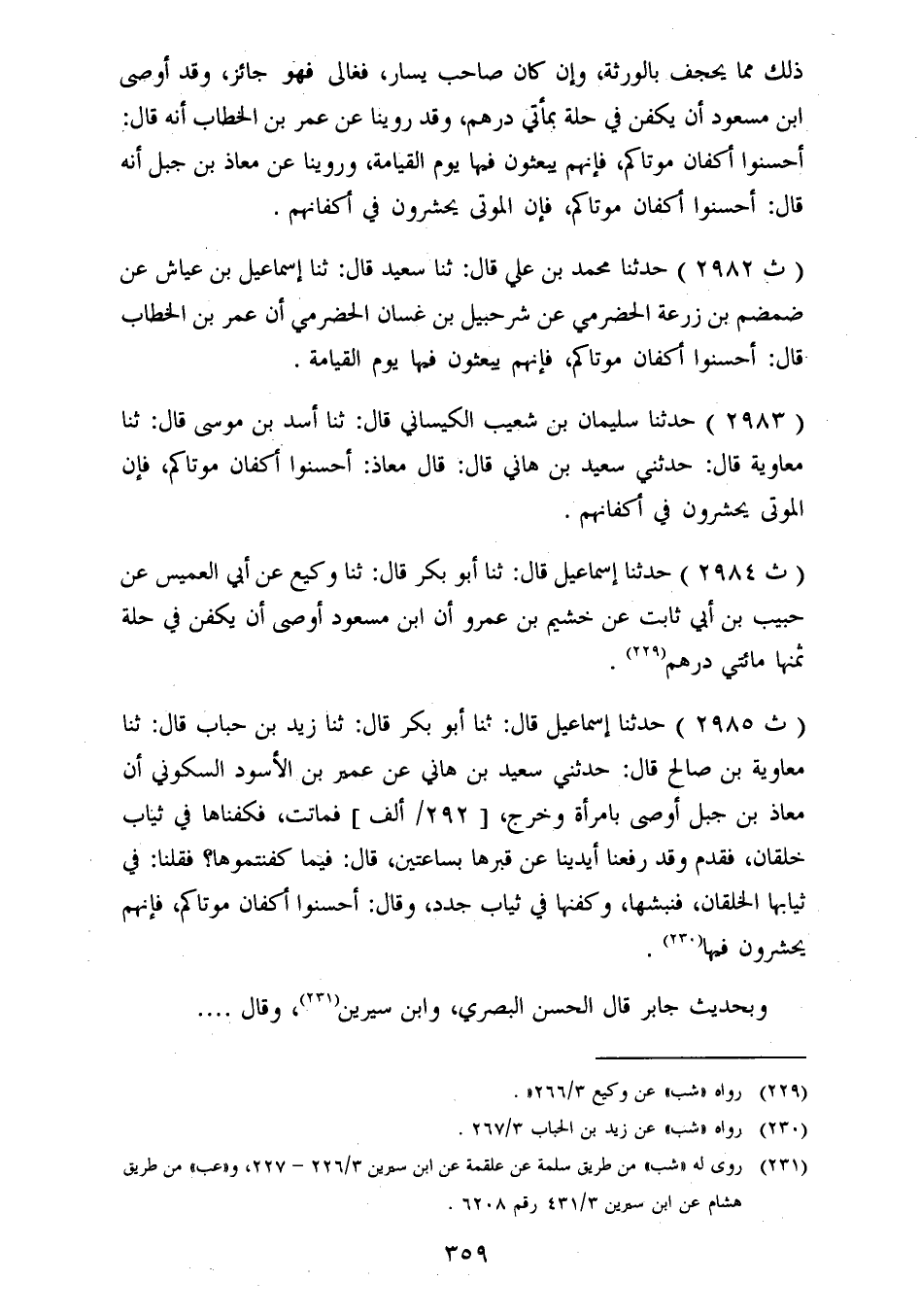 2984 - حَدَّثَنَا إِسْمَاعِيلُ، قَالَ: ثنا أَبُو بَكْرٍ، قَالَ: ثنا وَكِيعٌ، عَنْ أَبِي الْعُمَيْسِ، عَنْ حَبِيبِ بْنِ أَبِي ثَابِتٍ، عَنْ خُشَيْمِ بْنِ عَمْرٍو، أَنَّ ابْنَ مَسْعُودٍ، «أَوْصَى أَنْ يُكَفَّنَ، فِي حُلَّةٍ ثَمَنُهَا مِائَتَا دِرْهَمٍ»