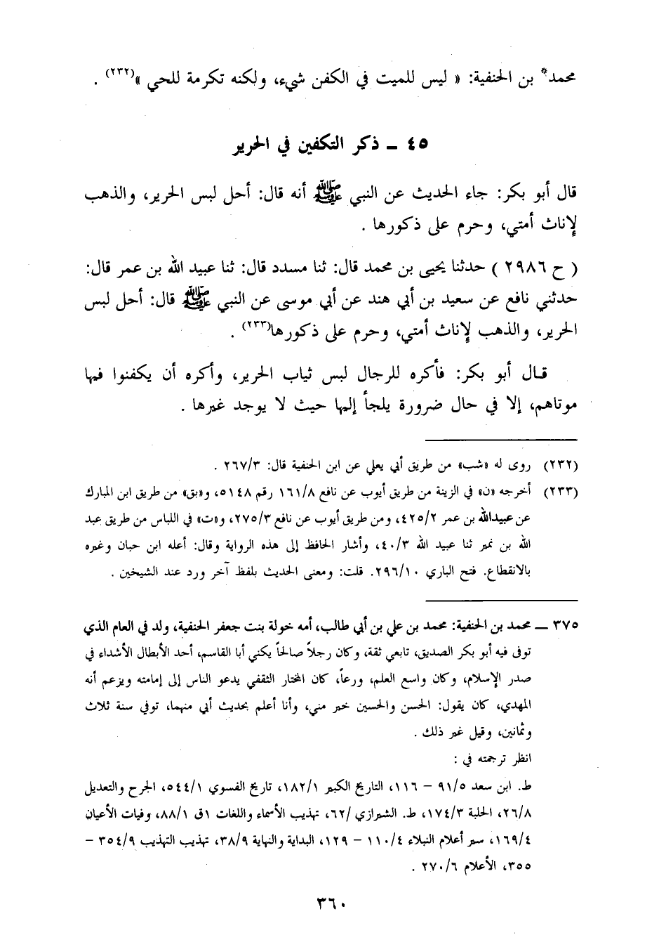 2986 - حَدَّثَنَا يَحْيَى بْنُ مُحَمَّدٍ، قَالَ: ثنا مُسَدَّدٌ، قَالَ: ثنا عُبَيْدُ اللهِ بْنُ عُمَرَ، قَالَ: حَدَّثَنِي نَافِعٌ، عَنْ سَعِيدِ بْنِ أَبِي هِنْدَ، عَنْ أَبِي مُوسَى، عَنِ النَّبِيِّ صَلَّى اللَّهُ عَلَيْهِ وَسَلَّمَ قَالَ: «أُحِلَّ لُبْسُ الْحَرِيرِ وَالذَّهَبِ لِإِنَاثِ أُمَّتِي، وَحُرِّمَ عَلَى ذُكُورِهَا» قَالَ أَبُو بَكْرٍ: فَأَكْرَهُ لِلرِّجَالِ لُبْسَ ثِيَابِ الْحَرِيرِ، وَأَكْرَهُ أَنْ يُكَفِّنُوا فِيهَا مَوْتَاهُمْ إِلَّا فِي حَالِ ضَرُورَةٍ يُلْجَأُ إِلَيْهَا حَيْثُ لَا يُوجَدُ غَيْرُهَا -[361]- وَمِمَّنْ كَرِهَ ذَلِكَ مِنْ أَهْلِ الْعِلْمِ الْحَسَنُ الْبَصْرِيُّ، وَعَبْدُ اللهِ بْنُ الْمُبَارَكِ، وَمَالِكُ بْنُ أَنَسٍ، وَأَحْمَدُ، وَإِسْحَاقُ بْنُ رَاهَوَيْهِ، وَلَا نَحْفَظُ عَنْ أَحَدٍ مِنْ أَهْلِ الْعِلْمِ خِلَافَهُمْ