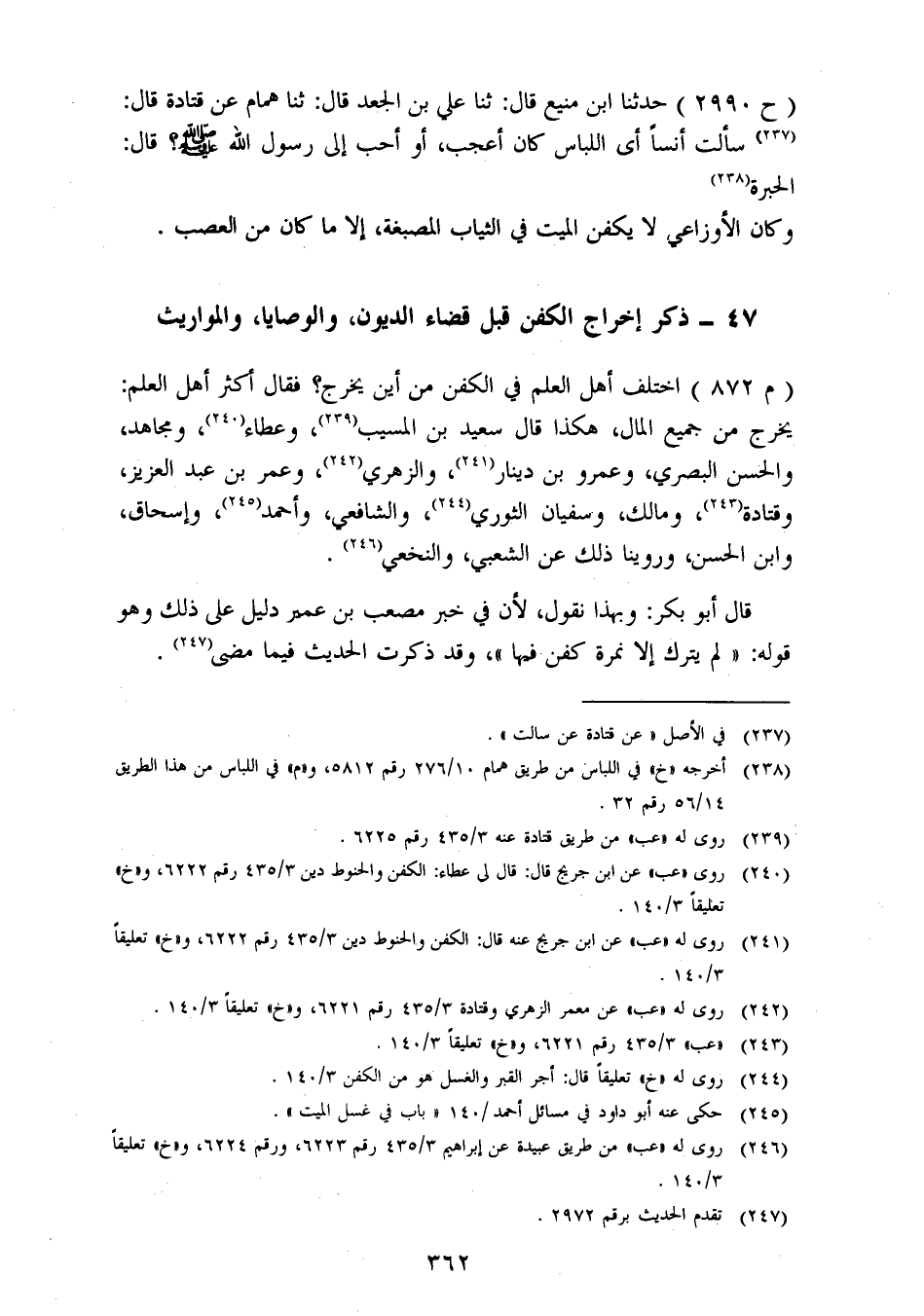 2990 - حَدَّثَنَا ابْنُ مَنِيعٍ، قَالَ: ثنا عَلِيُّ بْنُ الْجَعْدِ، قَالَ: ثنا هَمَّامٌ، عَنْ قَتَادَةَ، قَالَ: سَأَلْتُ أَنَسًا: أَيُّ اللِّبَاسِ كَانَ أَعْجَبَ، أَوْ أَحَبَّ إِلَى رَسُولِ اللهِ صَلَّى اللَّهُ عَلَيْهِ وَسَلَّمَ؟ قَالَ: «الْحِبَرَةُ» وَكَانَ الْأَوْزَاعِيُّ لَا يُكَفِّنُ الْمَيِّتَ فِي الثِّيَابِ الْمُصَبَّغَةِ، إِلَّا مَا كَانَ مِنَ الْعَصْبِ