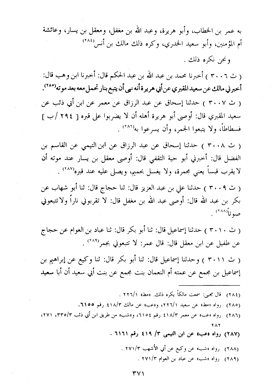 3006 - أَخْبَرَنَا مُحَمَّدُ بْنُ عَبْدِ اللهِ بْنِ عَبْدِ الْحَكَمِ، قَالَ: أَخْبَرَنَا ابْنُ وَهْبٍ، قَالَ: أَخْبَرَنِي مَالِكٌ، عَنْ سَعِيدٍ الْمَقْبُرِيِّ، عَنْ أَبِي هُرَيْرَةَ، «أَنَّهُ نَهَى أَنْ يُتْبَعَ، بِنَارٍ تُحْمَلُ مَعَهُ بَعْدَ مَوْتِهِ»