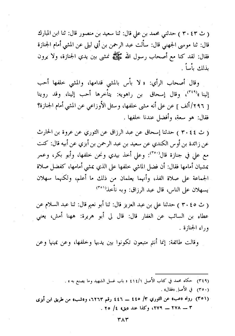 3043 - حَدَّثَنِي مُحَمَّدُ بْنُ عَلِيٍّ، قَالَ: ثنا سَعِيدُ بْنُ مَنْصُورٍ، قَالَ: ثنا ابْنُ الْمُبَارَكِ، قَالَ: ثنا مُوسَى الْجُهَنِيُّ، قَالَ: سَأَلْتُ عَبْدَ الرَّحْمَنِ بْنَ أَبِي لَيْلَى عَنِ الْمَشْيِ، أَمَامَ الْجَنَازَةِ فَقَالَ: «لَقَدْ كُنَّا مَعَ أَصْحَابِ رَسُولِ اللهِ صَلَّى اللَّهُ عَلَيْهِ وَسَلَّمَ نَمْشِي بَيْنَ يَدَيِ الْجَنَازَةِ، وَلَا يَرَوْنَ بِذَلِكَ بَأْسًا» وَقَالَ أَصْحَابُ الرَّأْيِ: لَا بَأْسَ بِالْمَشْيِ قُدَّامَهَا، وَالْمَشْيُ خَلْفَهَا أَحَبُّ إِلَيْنَا وَقَالَ إِسْحَاقُ بْنُ رَاهَوَيْهِ: «يَتَأَخَّرُهَا أَحَبُّ إِلَيْنَا» ، وَقَدْ رُوِّينَا عَنْ عَلِيٍّ أَنَّهُ مَشَى خَلْفَهَا، وَسُئِلَ الْأَوْزَاعِيُّ عَنِ الْمَشْيِ أَمَامَ الْجَنَازَةِ؟ فَقَالَ: «هُوَ سَعَةٌ، وَأَفْضَلُ عِنْدَنَا خَلْفَهَا»