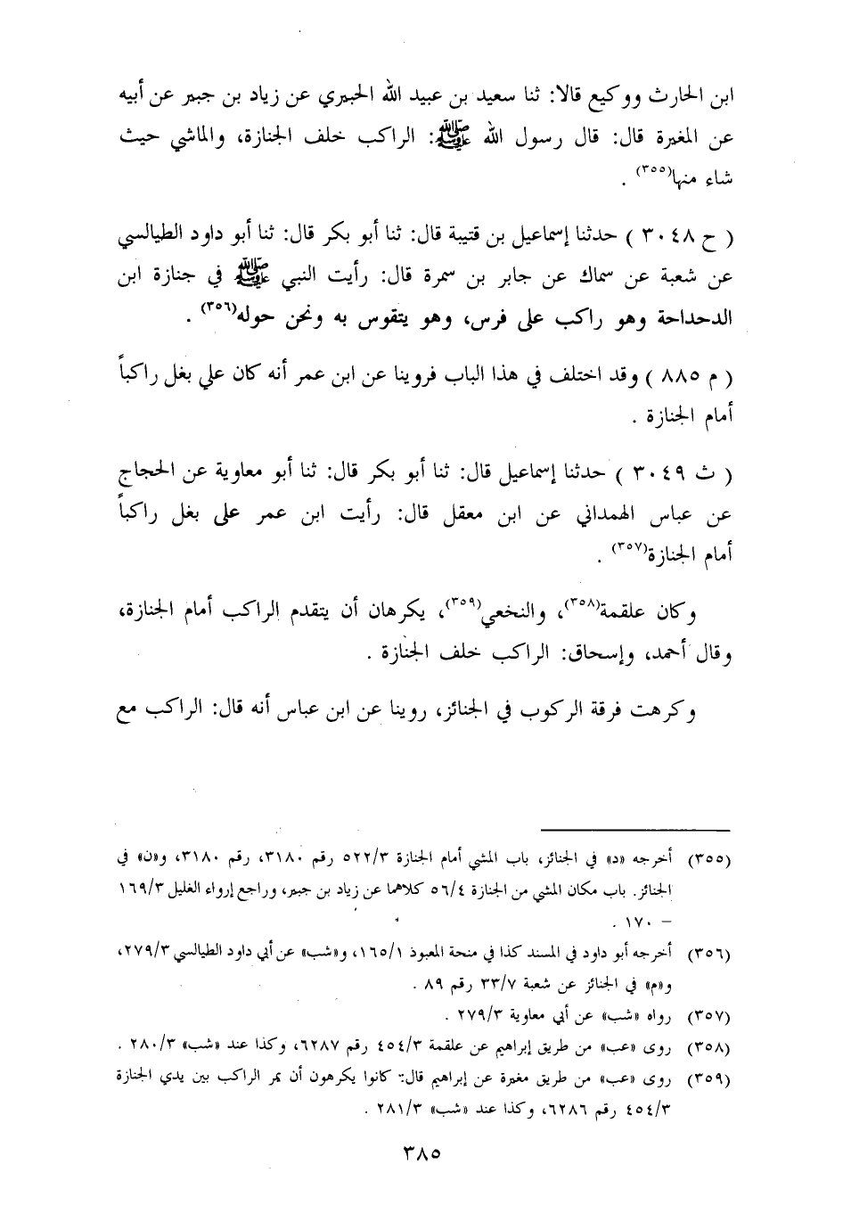 3049 - حَدَّثَنَا إِسْمَاعِيلُ، قَالَ: ثنا أَبُو بَكْرٍ، قَالَ: ثنا أَبُو مُعَاوِيَةَ، عَنِ الْحَجَّاجِ، عَنْ عَبَّاسٍ الْهَمْدَانِيِّ، عَنِ ابْنِ مَعْقِلٍ، قَالَ: «رَأَيْتُ ابْنَ عُمَرَ عَلَى بَغْلٍ رَاكِبًا أَمَامَ الْجَنَازَةِ» وَكَانَ عَلْقَمَةُ، وَالنَّخَعِيُّ يَكْرَهَانِ أَنْ يَتَقَدَّمَ الرَّاكِبُ أَمَامَ الْجَنَازَةِ، وَقَالَ أَحْمَدُ وَإِسْحَاقُ: " الرَّاكِبُ خَلْفَ الْجَنَازَةِ، وَكَرِهَتْ فِرْقَةٌ الرُّكُوبَ فِي الْجَنَائِزِ، رُوِّينَا عَنِ ابْنِ عَبَّاسٍ أَنَّهُ قَالَ: «الرَّاكِبُ مَعَ -[386]- الْجَنَازَةِ كَالْجَالِسِ فِي أَهْلِهِ» ، وَرُوِّينَا عَنْ ثَوْبَانَ أَنَّهُ قَالَ لِرَجُلٍ رَاكِبٍ فِي جَنَازَةٍ: «تَرْكَبُ وَعِبَادُ اللهِ يَمْشُونَ، وَأَخَذَ بِلِجَامِ دَابَّتِهِ فَجَعَلَ يَكْبَحُهَا» ، وَرُوِيَ عَنِ الشَّعْبِيِّ أَنَّهُ قَالَ كَقَوْلِ ابْنِ عَبَّاسٍ، وَقَدْ رُوِّينَا عَنِ ابْنِ عَبَّاسٍ رِوَايَةً أُخْرَى أَنَّهُ رُئِيَ رَاكِبًا فِي جَنَازَةٍ، وَقَالَ عَبْدُ اللهِ بْنُ رَبَاحٍ الْأَنْصَارِيُّ: «لِلْمَاشِي فِي الْجَنَازَةِ قِيرَاطَانِ وَلِلرَّاكِبِ قِيرَاطٌ»