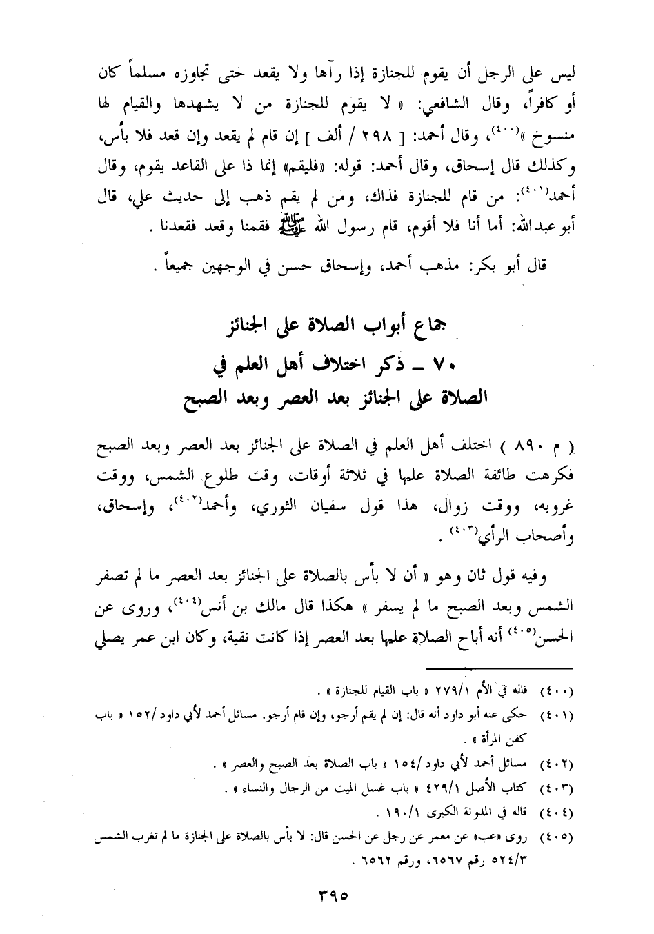 ذِكْرُ اخْتِلَافِ أَهْلِ الْعِلْمِ فِي الصَّلَاةِ عَلَى الْجَنَائِزِ بَعْدَ الْعَصْرِ وَبَعْدَ الصُّبْحِ اخْتَلَفَ أَهْلُ الْعِلْمِ فِي الصَّلَاةِ عَلَى الْجَنَائِزِ بَعْدَ الْعَصْرِ، وَبَعْدَ الصُّبْحِ فَكَرِهَتْ طَائِفَةٌ الصَّلَاةَ عَلَيْهَا فِي ثَلَاثَةِ أَوْقَاتٍ، وَقْتَ طُلُوعِ الشَّمْسِ، وَوَقْتَ غروبِهِ، وَوَقْتَ زَوَالٍ، هَذَا قَوْلُ سُفْيَانَ الثَّوْرِيِّ، وَأَحْمَدَ، وَإِسْحَاقَ، وَأَصْحَابِ الرَّأْيِ، وَفِيهِ قَوْلٌ ثَانٍ وَهُوَ، «أَنْ لَا بَأْسَ بِالصَّلَاةِ عَلَى الْجَنَائِزِ بَعْدَ الْعَصْرِ مَا لَمْ تَصْفَرَّ الشَّمْسُ، وَبَعْدَ الصُّبْحِ مَا لَمْ يُسْفِرْ» ، هَكَذَا قَالَ مَالِكُ بْنُ أَنَسٍ، وَرَوَى عَنِ الْحَسَنِ أَنَّهُ أَبَاحَ الصَّلَاةَ عَلَيْهَا بَعْدَ الْعَصْرِ إِذَا كَانَتْ نَقِيَّةً، وَكَانَ ابْنُ عُمَرَ يُصَلِّي -[396]- عَلَى الْجَنَازَةِ إِذَا طَلَعَتِ الشَّمْسُ حَتَّى تَرْتَفِعَ شَيْئًا