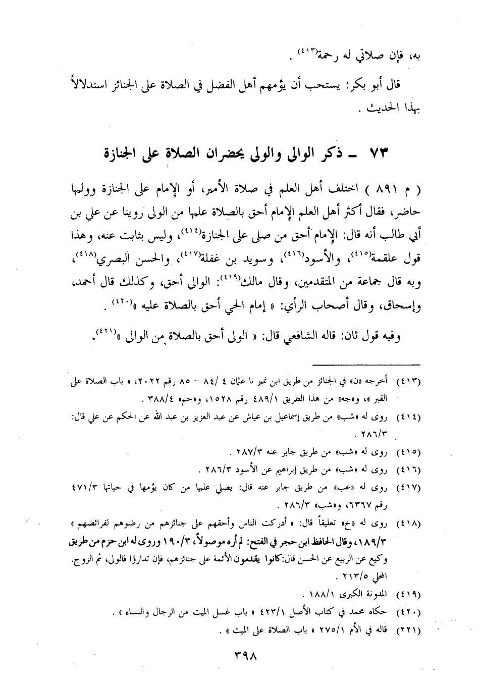 ذِكْرُ الْوَالِي وَالْوَلِيِّ يَحْضُرَانِ الصَّلَاةَ عَلَى الْجَنَازَةِ اخْتَلَفَ أَهْلُ الْعِلْمِ فِي صَلَاةِ الْأَمِيرِ، أَوِ الْإِمَامِ عَلَى الْجَنَازَةِ وَوَلِيُّهَا حَاضِرٌ، فَقَالَ أَكْثَرُ أَهْلِ الْعِلْمِ: الْإِمَامُ أَحَقُّ بِالصَّلَاةِ عَلَيْهَا مِنَ الْوَلِيِّ رُوِّينَا عَنْ عَلِيِّ بْنِ أَبِي طَالِبٍ أَنَّهُ قَالَ: «الْإِمَامُ أَحَقُّ مَنْ صَلَّى عَلَى الْجَنَازَةِ» ، وَلَيْسَ بِثَابِتٍ عَنْهُ، وَهَذَا قَوْلُ عَلْقَمَةَ، وَالْأَسْوَدِ، وَسُوَيْدِ بْنِ غَفَلَةَ، وَالْحَسَنِ الْبَصْرِيِّ، وَبِهِ قَالَ جَمَاعَةٌ مِنَ الْمُتَقَدِّمِينَ، وَقَالَ مَالِكٌ: «الْوَالِي أَحَقُّ» وَكَذَلِكَ قَالَ أَحْمَدُ، وَإِسْحَاقُ، وَقَالَ أَصْحَابُ الرَّأْيِ: «إِمَامُ الْحَيِّ أَحَقُّ بِالصَّلَاةِ عَلَيْهِ» ، وَفِيهِ قَوْلٌ ثَانٍ: قَالَهُ الشَّافِعِيُّ قَالَ: «الْوَلِيُّ أَحَقُّ بِالصَّلَاةِ مِنَ الْوَالِي» ،