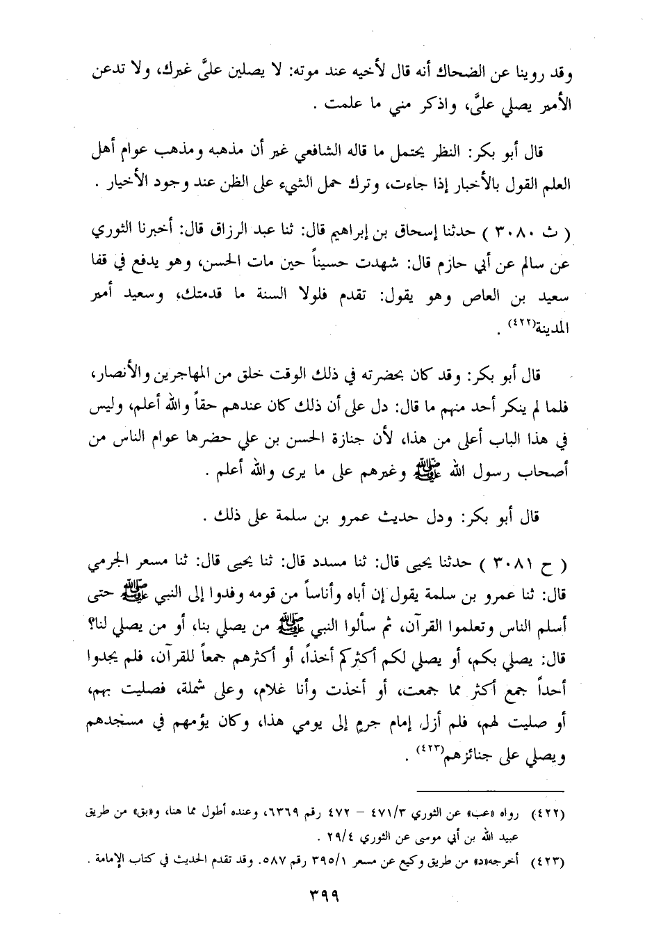 3080 - حَدَّثَنَا إِسْحَاقُ بْنُ إِبْرَاهِيمَ، قَالَ: ثنا عَبْدُ الرَّزَّاقِ، قَالَ: أَخْبَرَنَا الثَّوْرِيُّ، عَنْ سَالِمٍ، عَنْ أَبِي حَازِمٍ، قَالَ: شَهِدْتُ حُسَيْنًا حِينَ مَاتَ الْحَسَنُ، وَهُوَ يَدْفَعُ فِي قَفَا سَعِيدِ بْنِ الْعَاصِ وَهُوَ يَقُولُ: «تَقَدَّمْ فَلَوْلَا السُّنَّةُ مَا قَدَّمْتُكَ، وَسَعِيدٌ أَمِيرُ الْمَدِينَةِ» قَالَ أَبُو بَكْرٍ: وَقَدْ كَانَ بِحَضْرَتِهِ فِي ذَلِكَ الْوَقْتِ خَلْقٌ مِنَ الْمُهَاجِرِينَ، وَالْأَنْصَارِ، فَلَمَّا لَمْ يُنْكِرْ أَحَدٌ مِنْهُمْ مَا قَالَ: دَلَّ عَلَى أَنَّ ذَلِكَ كَانَ عِنْدَهُمْ حَقًّا وَاللهُ أَعْلَمُ، وَلَيْسَ فِي هَذَا الْبَابِ أَعْلَى مِنْ هَذَا، لِأَنَّ جَنَازَةَ الْحَسَنِ بْنِ عَلِيٍّ حَضَرَهَا عَوَامِ النَّاسِ مِنْ أَصْحَابِ رَسُولِ اللهِ صَلَّى اللَّهُ عَلَيْهِ وَسَلَّمَ وَغَيْرِهِمْ عَلَى مَا يُرَى وَاللهُ أَعْلَمُ قَالَ أَبُو بَكْرٍ: وَدَلَّ حَدِيثُ عَمْرِو بْنِ سَلَمَةَ عَلَى ذَلِكَ