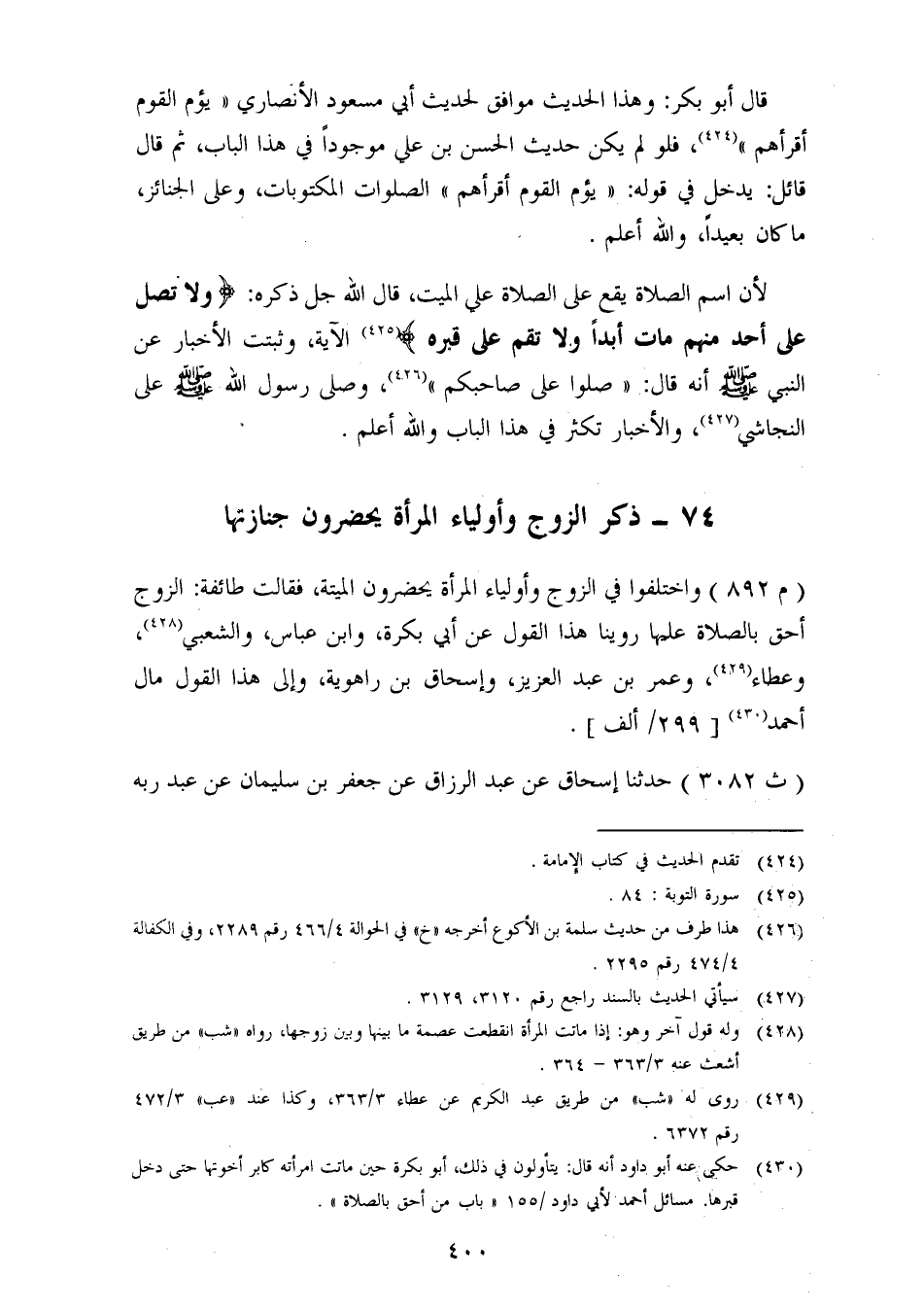 ذِكْرُ: الزَّوْجُ وَأَوْلِيَاءُ الْمَرْأَةِ يَحْضُرُونَ جَنَازَتَهَا وَاخْتَلَفُوا فِي الزَّوْجِ وَأَوْلِيَاءُ الْمَرْأَةِ يَحْضُرُونَ الْمَيْتَةَ، فَقَالَتْ طَائِفَةٌ: الزَّوْجُ أَحَقُّ بِالصَّلَاةِ عَلَيْهَا، رُوِّينَا هَذَا الْقَوْلَ عَنْ أَبِي بَكْرَةَ، وَابْنِ عَبَّاسٍ، وَالشَّعْبِيِّ، وَعَطَاءٍ، وَعُمَرَ بْنِ عَبْدِ الْعَزِيزِ، وَإِسْحَاقَ بْنِ رَاهَوَيْهِ، وَإِلَى هَذَا الْقَوْلِ مَالَ أَحْمَدُ