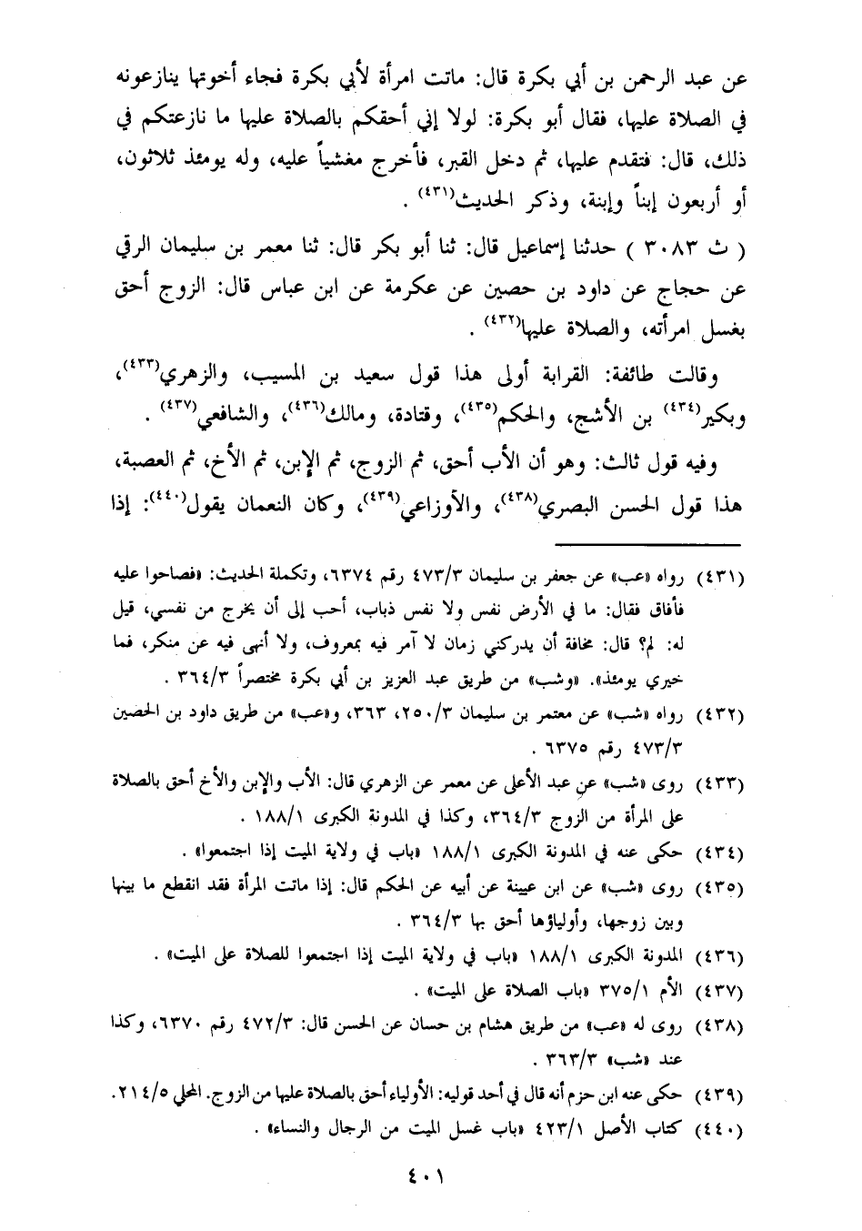 3083 - حَدَّثَنَا إِسْمَاعِيلُ، قَالَ: ثنا أَبُو بَكْرٍ، قَالَ: ثنا مَعْمَرُ بْنُ سُلَيْمَانَ الرَّقِّيُّ، عَنْ حَجَّاجٍ، عَنْ دَاوُدَ بْنِ حُصَيْنٍ، عَنْ عِكْرِمَةَ، عَنِ ابْنِ عَبَّاسٍ، قَالَ: «الزَّوْجُ أَحَقُّ بِغُسْلِ امْرَأَتِهِ، وَالصَّلَاةُ عَلَيْهَا» وَقَالَتْ طَائِفَةٌ: الْقَرَابَةُ أَوْلَى هَذَا قَوْلُ سَعِيدِ بْنِ الْمُسَيِّبِ، وَالزُّهْرِيِّ، وَبُكَيْرِ بْنِ الْأَشَجِّ، وَالْحَكَمِ، وَقَتَادَةَ، وَمَالِكٍ، وَالشَّافِعِيِّ، وَفِيهِ قَوْلٌ ثَالِثٌ: وَهُوَ أَنَّ الْأَبَ أَحَقُّ، ثُمَّ الزَّوْجُ، ثُمَّ الِابْنُ، ثُمَّ الْأَخُ، ثُمَّ الْعَصَبَةُ، هَذَا قَوْلُ الْحَسَنِ الْبَصْرِيِّ:، وَالْأَوْزَاعِيِّ، وَكَانَ النُّعْمَانُ يَقُولُ: «إِذَا -[402]- كَانَ الْمَيِّتُ امْرَأَةً مَعَهَا زَوْجُهَا وَابْنُهَا، وَهُوَ ابْنُ الزَّوْجِ، يَنْبَغِي أَنْ يَقْدُمَ الْأَبَ»