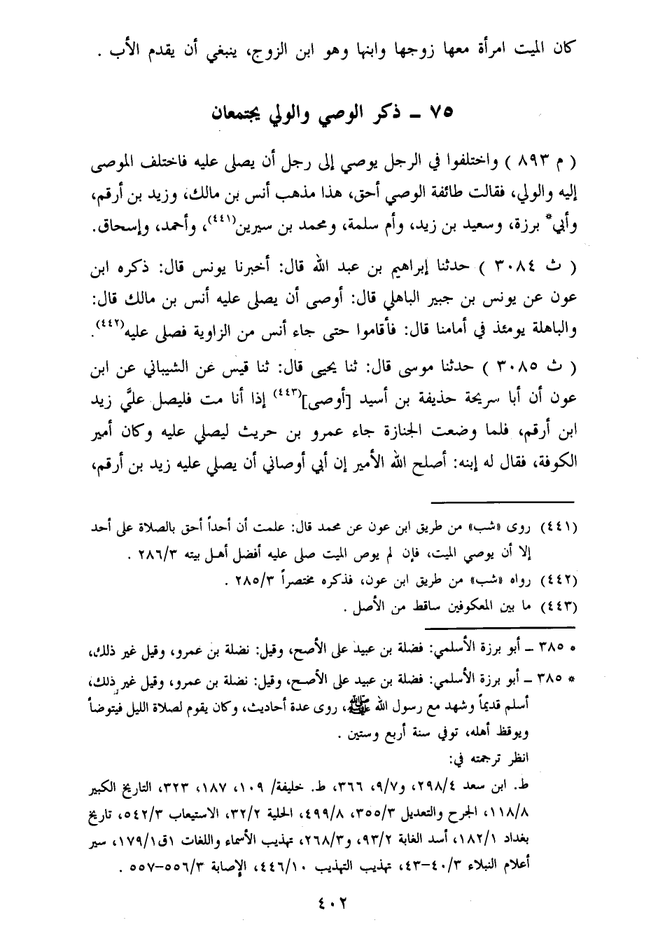 3085 - حَدَّثَنَا مُوسَى، قَالَ: ثنا يَحْيَى، قَالَ: ثنا قَيْسٌ، عَنِ الشَّيْبَانِيِّ، عَنِ ابْنِ عَوْنٍ، أَنَّ أَبَا سَرِيحَةَ حُذَيْفَةَ بْنَ أَسِيدٍ " أَوْصَى إِذَا أَنَا مِتُّ، فَلْيُصَلِّ عَلَيَّ زَيْدُ بْنُ أَرْقَمَ، فَلَمَّا وُضِعَتِ الْجَنَازَةُ جَاءَ عَمْرُو بَنُ حُرَيْثٍ لِيُصَلِّيَ عَلَيْهِ وَكَانَ أَمِيرَ الْكُوفَةِ، فَقَالَ لَهُ ابْنُهُ: أَصْلَحَ اللهُ الْأَمِيرَ إِنَّ أَبِي أَوْصَانِي أَنْ يُصَلِّيَ عَلَيْهِ زَيْدُ بْنُ أَرْقَمَ -[403]- قَالَ: فَقَدَّمَ زَيْدًا "