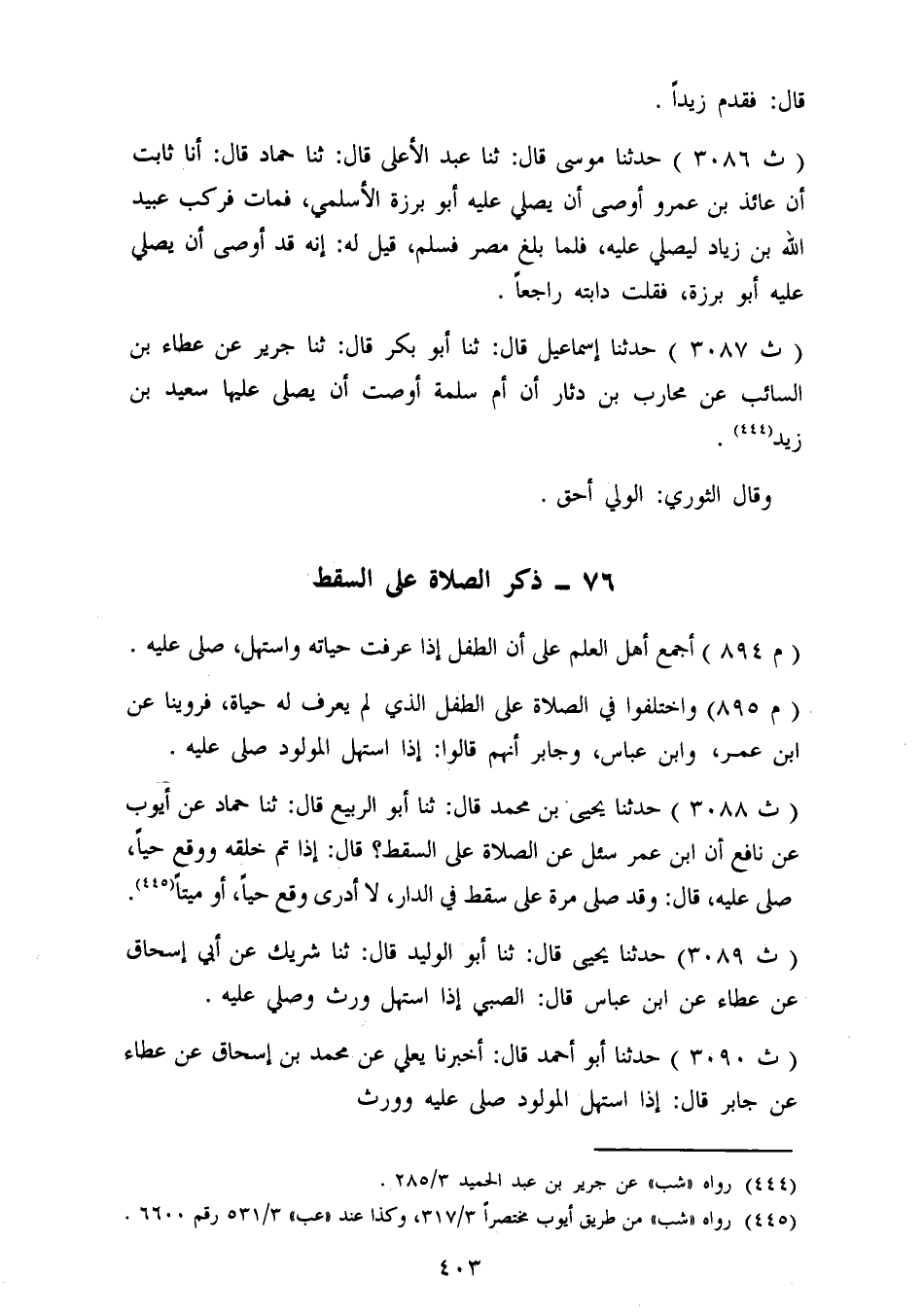 3088 - حَدَّثَنَا يَحْيَى بْنُ مُحَمَّدٍ، قَالَ: ثنا أَبُو الرَّبِيعِ، قَالَ: ثنا حَمَّادٌ، عَنْ أَيُّوبَ، عَنْ نَافِعٍ، أَنَّ ابْنَ عُمَرَ، سُئِلَ، عَنِ الصَّلَاةِ، عَلَى السَّقْطِ؟ قَالَ: " إِذَا تَمَّ خَلْقُهُ وَوَقَعَ حَيًّا، صُلِّيَ عَلَيْهِ قَالَ: وَقَدْ صَلَّى مَرَّةً عَلَى سَقْطٍ فِي الدَّارِ، لَا أَدْرِي وَقَعَ حَيًّا، أَوْ مَيِّتًا "