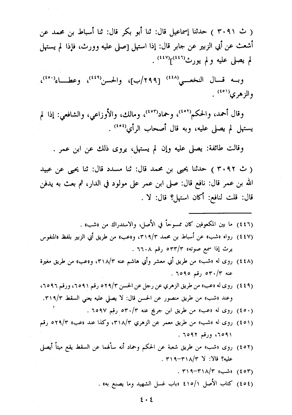 3091 - حَدَّثَنَا إِسْمَاعِيلُ، قَالَ: ثنا أَبُو بَكْرٍ، قَالَ: ثنا أَسْبَاطُ بْنُ مُحَمَّدٍ، عَنْ أَشْعَثَ، عَنْ أَبِي الزُّبَيْرِ، عَنْ جَابِرٍ، قَالَ: «إِذَا اسْتَهَلَّ صُلِّيَ عَلَيْهِ وَوَرِثَ، فَإِذَا لَمْ يَسْتَهِلَّ لَمْ يُصَلَّ عَلَيْهِ وَلَمْ يُورَثْ» وَبِهِ قَالَ النَّخَعِيُّ، وَالْحَسَنُ:، وَعَطَاءٌ، وَالزُّهْرِيُّ، وَقَالَ أَحْمَدُ، وَالْحَكَمُ، وَحَمَّادٌ، وَمَالِكٌ، وَالْأَوْزَاعِيُّ، وَالشَّافِعِيُّ: " إِذَا لَمْ يَسْتَهِلْ لَمْ يُصَلَّ عَلَيْهِ، وَبِهِ قَالَ أَصْحَابُ الرَّأْيِ، وَقَالَتْ طَائِفَةٌ: يُصَلَّى عَلَيْهِ وَإِنْ لَمْ يَسْتَهِلْ، يُرْوَى ذَلِكَ، عَنِ ابْنِ عُمَرَ