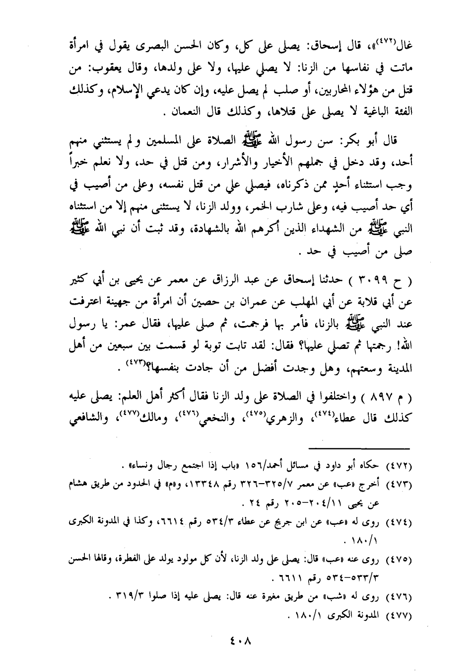 3099 - حَدَّثَنَا إِسْحَاقُ، عَنْ عَبْدِ الرَّزَّاقِ، عَنْ مَعْمَرٍ، عَنْ يَحْيَى بْنِ أَبِي كَثِيرٍ، عَنْ أَبِي قِلَابَةَ، عَنْ أَبِي الْمُهَلَّبِ، عَنْ عِمْرَانَ بْنِ حُصَيْنٍ، أَنَّ امْرَأَةً، مِنْ جُهَيْنَةَ اعْتَرَفَتْ عِنْدَ النَّبِيِّ صَلَّى اللَّهُ عَلَيْهِ وَسَلَّمَ بِالزِّنَا، فَأَمَرَ بِهَا فَرُجِمَتْ، ثُمَّ صَلَّى عَلَيْهَا، فَقَالَ عُمَرُ: يَا رَسُولَ اللهِ رَجَمْتَهَا ثُمَّ تُصَلِّي عَلَيْهَا؟ فَقَالَ: " لَقَدْ تَابَتْ تَوْبَةً لَوْ قُسِّمَتْ بَيْنَ سَبْعِينَ مِنْ أَهْلِ الْمَدِينَةِ وَسِعَتْهُمْ، وَهَلْ وَجَدْتَ أَفْضَلَ مِنْ أَنْ جَادَتْ بِنَفْسِهَا؟ وَاخْتَلَفُوا فِي الصَّلَاةِ عَلَى وَلَدِ الزِّنَا فَقَالَ أَكْثَرُ أَهْلِ الْعِلْمِ: يُصَلَّى عَلَيْهِ كَذَلِكَ قَالَ عَطَاءٌ، وَالزُّهْرِيُّ، وَالنَّخَعِيُّ، وَمَالِكٌ، وَالشَّافِعِيُّ، -[409]- وَأَحْمَدُ، وَإِسْحَاقُ، وَكَانَ قَتَادَةُ يَقُولُ: «لَا يُصَلَّى عَلَيْهِ» ، وَاخْتُلِفَ فِيهِ عَنْ ابْنِ عُمَرَ فَقِيلَ: إِنَّهُ صَلَّىعَلَيْهِ، وَرُوِيَ عَنْهُ أَنَّهُ كَانَ لَا يُصَلِّي عَلَيْهِ وَاخْتَلَفُوا فِي الصَّلَاةِ عَلَى مَنْ قَتَلَ نَفْسَهُ فَكَانَ الْحَسَنُ، وَالنَّخَعِيُّ، وَقَتَادَةُ يَرَوْنَ الصَّلَاةَ عَلَيْهِ، وَقَالَ الْأَوْزَاعِيُّ: «لَا يُصَلَّى عَلَيْهِ، وَذُكِرَ أَنَّ عُمَرَ بْنَ عَبْدِ الْعَزِيزِ لَمْ يُصَلِّ عَلَيْهِ»