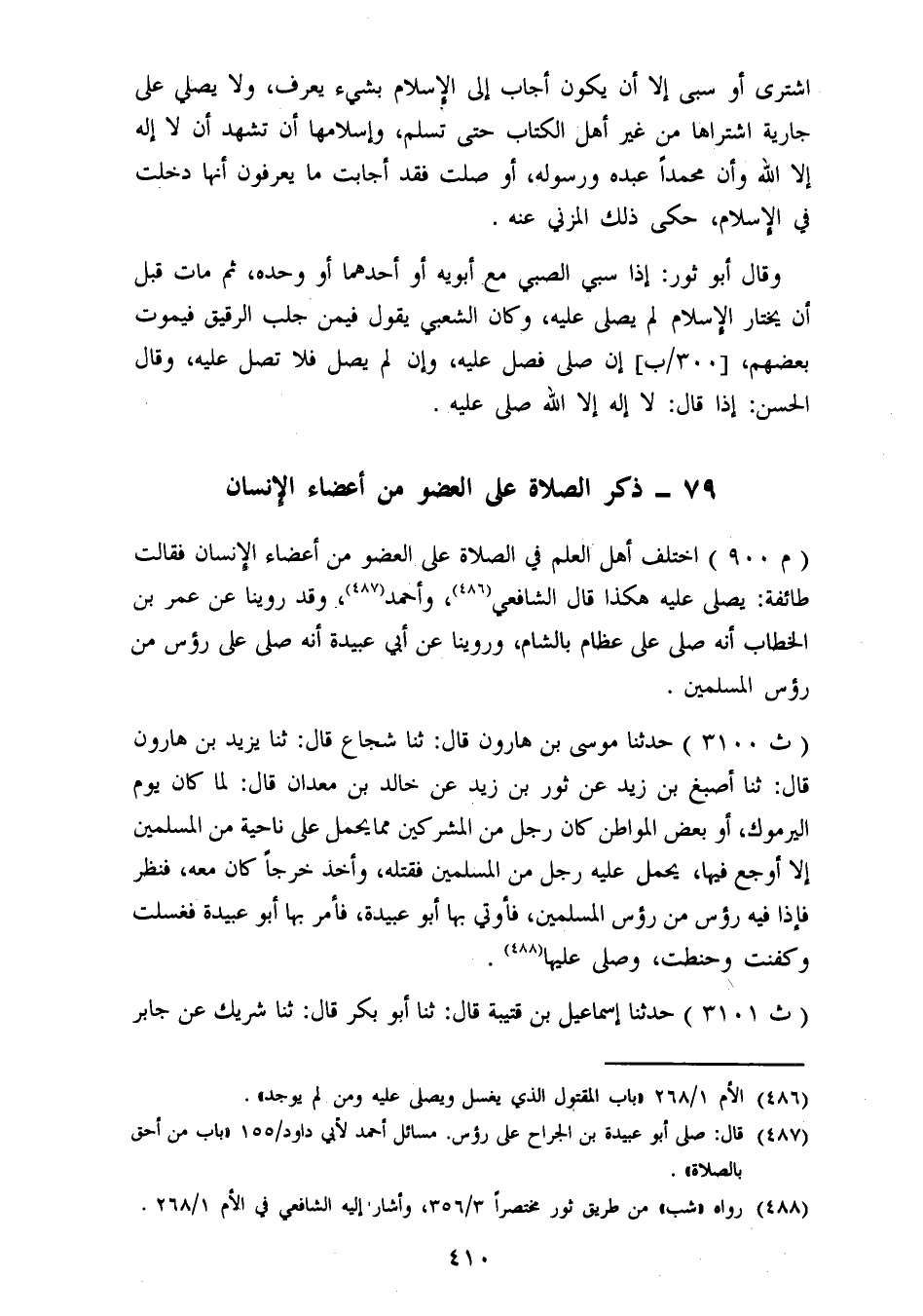 3101 - حَدَّثَنَا إِسْمَاعِيلُ بْنُ قُتَيْبَةَ، قَالَ: ثنا أَبُو بَكْرٍ، قَالَ: ثنا شَرِيكٌ، عَنْ جَابِرٍ، -[411]- عَنْ عَامِرٍ، أَنَّ عُمَرَ، صَلَّى عَلَى عِظَامٍ بِالشَّامِ وَكَانَ الشَّعْبِيُّ يَقُولُ: «يُصَلَّى عَلَى الْبَدَنِ» ، وَقَالَ مَالِكٌ: «لَا يُصَلَّى عَلَى يَدٍ، وَلَا عَلَى رَأْسٍ، وَلَا عَلَى رِجْلٍ، وَيُصَلَّى عَلَى الْبَدَنِ» ، وَكَانَ الْأَوْزَاعِيُّ يَقُولُ: «فِي الْعُضْوِ يُوجَدُ، يُوَارَى» . قَالَ أَبُو بَكْرٍ: وَأَصْحَابُ الرَّأْيِ لَا يَرَوْنَ الصَّلَاةَ عَلَى الرِّجْلِ وَالْيَدِ يُوجَدُ، إِذَا لَمْ يُوجَدِ الْبَدَنُ، وَإِذَا وُجِدَ نِصْفُ الْبَدَنِ، وَفِيهِ الرَّأْسُ، غُسِّلَ وَكُفِّنَ، وَصُلِّيَ عَلَيْهِ عِنْدَهُمْ قَالَ أَبُو بَكْرٍ: لَعَلَّ مِنْ حُجَّةِ مَنْ رَأَى لَا يُصَلَّى عَلَى الْعُضْوِ، أَنْ يَقُولَ: رَسُولُ اللهِ صَلَّى اللَّهُ عَلَيْهِ وَسَلَّمَ صَلَّى الصَّلَاةَ عَلَى الْمَيِّتِ، وَالصَّلَاةُ عَلَى الْمَيِّتِ سُنَّةٌ، وَلَا سُنَّةَ تَثْبُتُ فِي الصَّلَاةِ عَلَى بَعْضِ الْبَدَنِ، فَيُصَلِّي حَيْثُ صَلَّى رَسُولُ اللهِ صَلَّى اللَّهُ عَلَيْهِ وَسَلَّمَ، وَيَقِفُ عَنِ الصَّلَاةِ فِيمَا لَا سُنَّةَ فِيهِ، وَمِنْ حُجَّةِ مَنْ يَرَى الصَّلَاةَ عَلَى الْعُضْوِ يُوجَدُ، أَنَّ حُرْمَةَ الْمُسْلِمِ وَاحِدَةٌ فِي كُلِّ جَسَدِهِ، فَإِذَا ذَهَبَ بَعْضُهُ لَمْ تَذْهَبْ حُرْمَةُ مَا بَقِيَ، وَيَجِبُ أَنْ يُفْعَلَ فِيمَا بَقِيَ مِنْ بَدَنِهِ مِنَ الْغُسْلِ، وَالصَّلَاةِ، وَالدَّفْنُ سُنَّةُ الْمَوْتَى، وَاللهُ أَعْلَمُ، وَلَا يَثْبُتْ عَنْ عُمَرَ، وَأَبِي عُبَيْدَةَ مَا رُوِيَ عَنْهُمَا