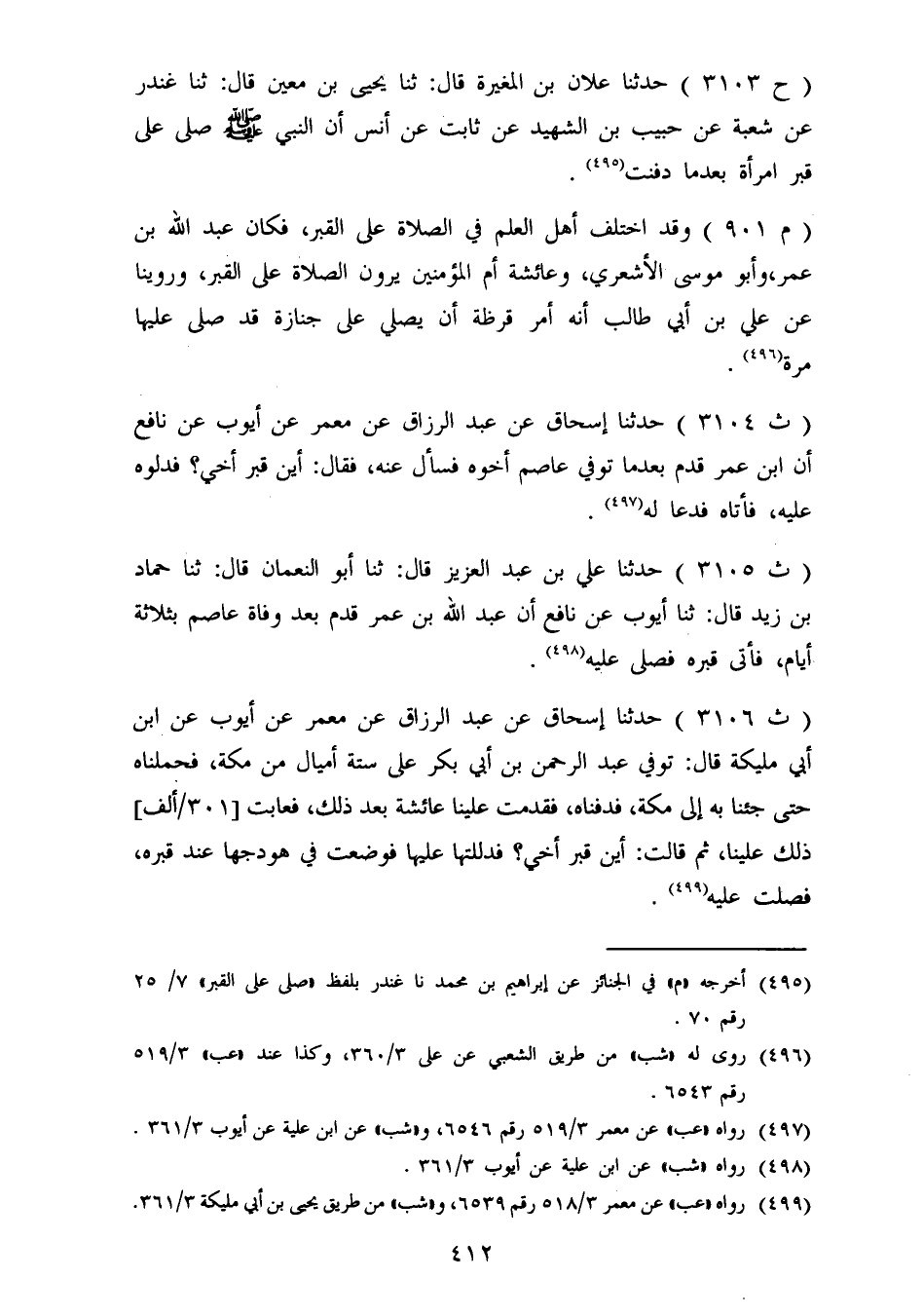 3105 - حَدَّثَنَا عَلِيُّ بْنُ عَبْدِ الْعَزِيزِ، قَالَ: ثنا أَبُو النُّعْمَانِ، قَالَ: ثنا حَمَّادُ بْنُ زَيْدٍ، قَالَ: ثنا أَيُّوبُ، عَنْ نَافِعٍ، أَنَّ عَبْدَ اللهِ بْنَ عُمَرَ، «قَدِمَ بَعْدَ وَفَاةِ عَاصِمٍ بِثَلَاثَةِ أَيَّامٍ، فَأَتَى قَبْرَهُ فَصَلَّى عَلَيْهِ»