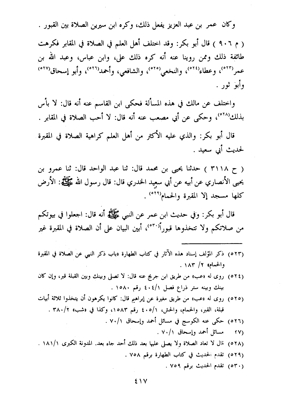 3118 - حَدَّثَنَا يَحْيَى بْنُ مُحَمَّدٍ، قَالَ: ثنا عَبْدُ الْوَاحِدِ، قَالَ: ثنا عَمْرُو بْنُ يَحْيَى الْأَنْصَارِيُّ، عَنْ أَبِيهِ، عَنْ أَبِي سَعِيدٍ الْخُدْرِيِّ، قَالَ: قَالَ رَسُولُ اللهِ صَلَّى اللَّهُ عَلَيْهِ وَسَلَّمَ: «الْأَرْضُ كُلُّهَا مَسْجِدٌ إِلَّا الْمَقْبَرَةَ وَالْحَمَّامَ» قَالَ أَبُو بَكْرٍ: وَفِي حَدِيثِ ابْنِ عُمَرَ، عَنِ النَّبِيِّ صَلَّى اللَّهُ عَلَيْهِ وَسَلَّمَ، أَنَّهُ قَالَ: «اجْعَلُوا فِي بُيُوتِكُمْ مِنْ صَلَاتِكُمْ، وَلَا تَتَّخِذُوهَا قُبُورًا» ، أَبْيَنُ الْبَيَانِ عَلَى أَنَّ الصَّلَاةَ فِي الْمَقْبَرَةِ غَيْرُ -[418]- جَائِزٍ، وَقَدْ ذَكَرْتُ إِسْنَادَهُ فِي كِتَابِ الطَّهَارَةِ