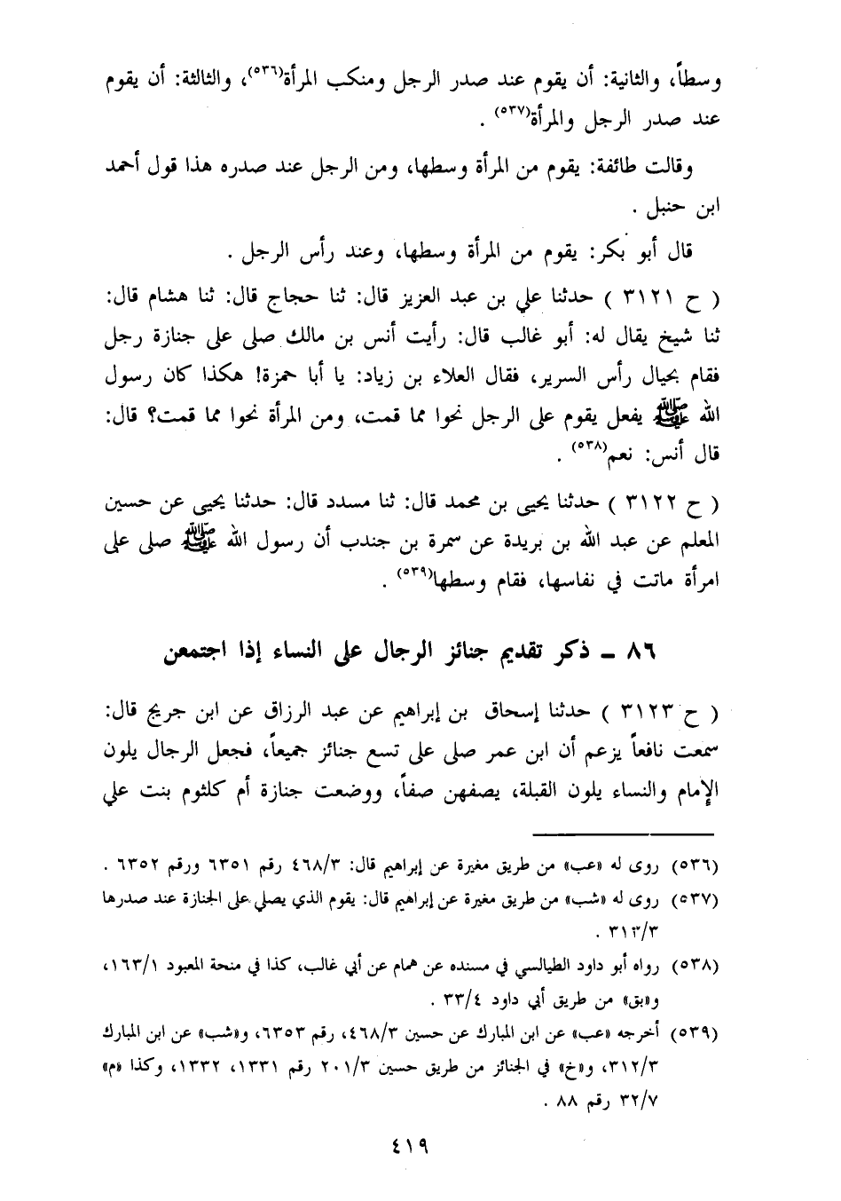 وَسَطًا، وَالثَّانِيَةَ: أَنْ يَقُومَ عِنْدَ صَدْرِ الرَّجُلِ وَمِنْكَبِ الْمَرْأَةِ، وَالثَّالِثَةَ: أَنْ يَقُومَ عِنْدَ صَدْرِ الرَّجُلِ وَالْمَرْأَةِ. وَقَالَتْ طَائِفَةٌ: يَقُومُ مِنَ الْمَرْأَةِ وَسَطَهَا، وَمِنَ الرَّجُلِ عِنْدَ صَدْرِهِ، هَذَا قَوْلُ أَحْمَدَ بْنِ حَنْبَلٍ قَالَ أَبُو بَكْرٍ: يَقُومُ مِنَ الْمَرْأَةِ وَسَطَهَا، وَعِنْدَ رَأْسِ الرَّجُلِ