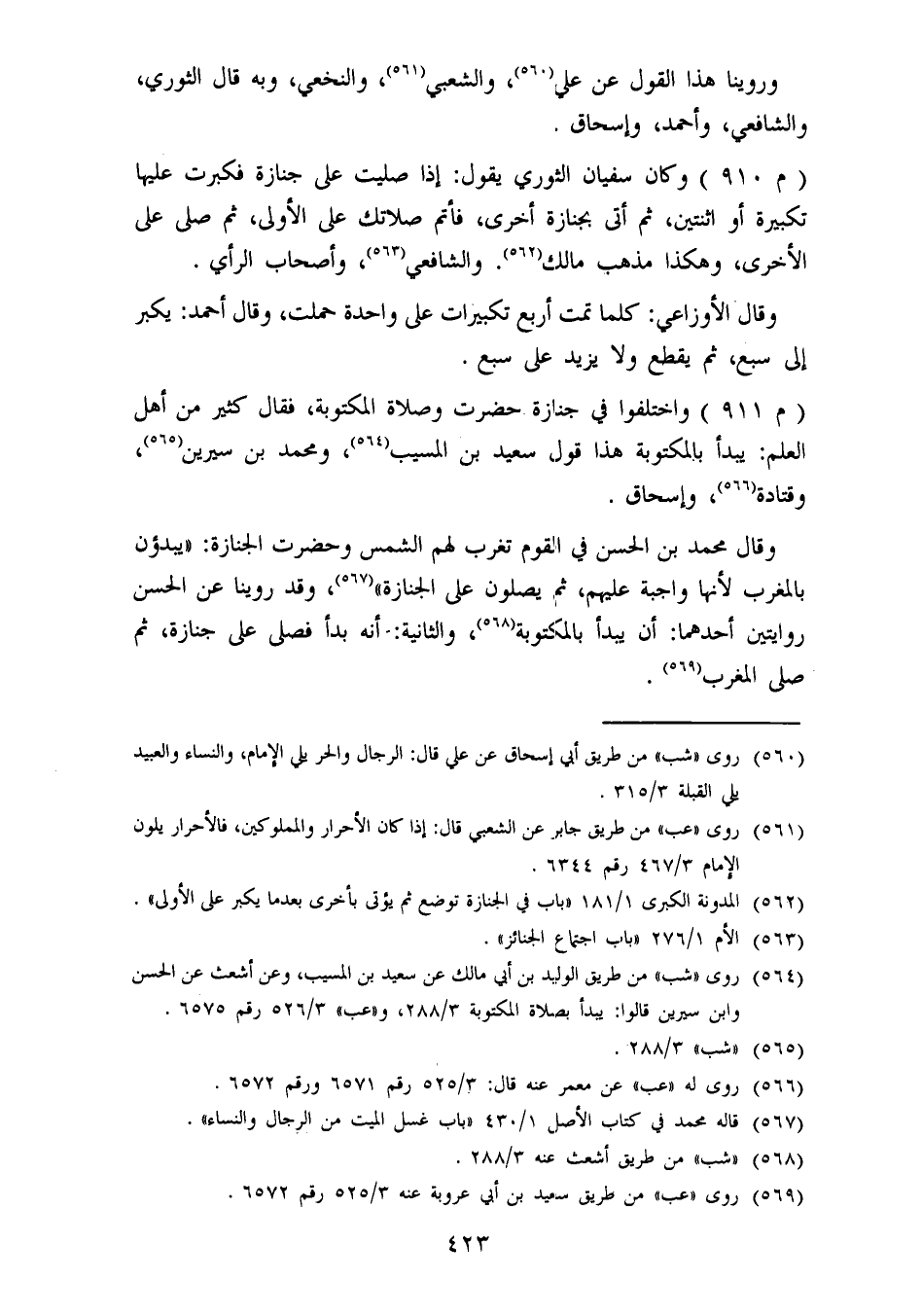 وَرُوِّينَا هَذَا الْقَوْلَ عَنْ عَلِيٍّ، وَالشَّعْبِيِّ، وَالنَّخَعِيِّ، وَبِهِ قَالَ الثَّوْرِيُّ، وَالشَّافِعِيُّ، وَأَحْمَدُ، وَإِسْحَاقُ وَكَانَ سُفْيَانُ الثَّوْرِيُّ يَقُولُ: " إِذَا صَلَّيْتَ عَلَى جَنَازَةٍ فَكَبَّرْتَ عَلَيْهَا تَكْبِيرَةً أَوِ اثْنَتَيْنٍ، ثُمَّ أُتِيتَ بِجِنَازَةٍ أُخْرَى، فَأَتِمَّ صَلَاتَكَ عَلَى الْأُولَى، ثُمَّ صَلِّ عَلَى الْأُخْرَى، وَهَكَذَا مَذْهَبُ مَالِكٍ، وَالشَّافِعِيِّ، وَأَصْحَابِ الرَّأْيِ. وَقَالَ الْأَوْزَاعِيُّ: «كُلَّمَا تَمَّتْ أَرْبَعُ تَكْبِيرَاتٍ عَلَى وَاحِدَةٍ حُمِلَتْ» ، وَقَالَ أَحْمَدُ: «يُكَبِّرُ إِلَى سَبْعٍ، ثُمَّ يَقْطَعُ وَلَا يَزِيدُ عَلَى سَبْعٍ» وَاخْتَلَفُوا فِي جَنَازَةٍ حَضَرَتْ وَصَلَاةِ الْمَكْتُوبَةِ، فَقَالَ كَثِيرٌ مِنْ أَهْلِ الْعِلْمِ: يُبْدَأُ بِالْمَكْتُوبَةِ، هَذَا قَوْلُ سَعِيدِ بْنِ الْمُسَيِّبِ، وَمُحَمَّدِ بْنِ سِيرِينَ، وَقَتَادَةَ، وَإِسْحَاقَ، وَقَالَ مُحَمَّدُ بْنُ الْحَسَنِ فِي الْقَوْمِ تَغْرُبُ لَهُمُ الشَّمْسُ وَحَضَرَتِ الْجَنَازَةُ: يَبْدَءُونَ بِالْمَغْرِبِ لِأَنَّهَا وَاجِبَةٌ عَلَيْهِمْ، ثُمَّ يُصَلُّونَ عَلَى الْجَنَازَةِ، وَقَدْ رُوِّينَا عَنِ الْحَسَنِ رِوَايَتَيْنِ، إِحْدَاهُمَا: أَنْ يُبْدَأَ بِالْمَكْتُوبَةِ، وَالثَّانِيَةُ: أَنَّهُ بَدَأَ فَصَلَّى عَلَى جَنَازَةٍ، ثُمَّ صَلَّى الْمَغْرِبَ