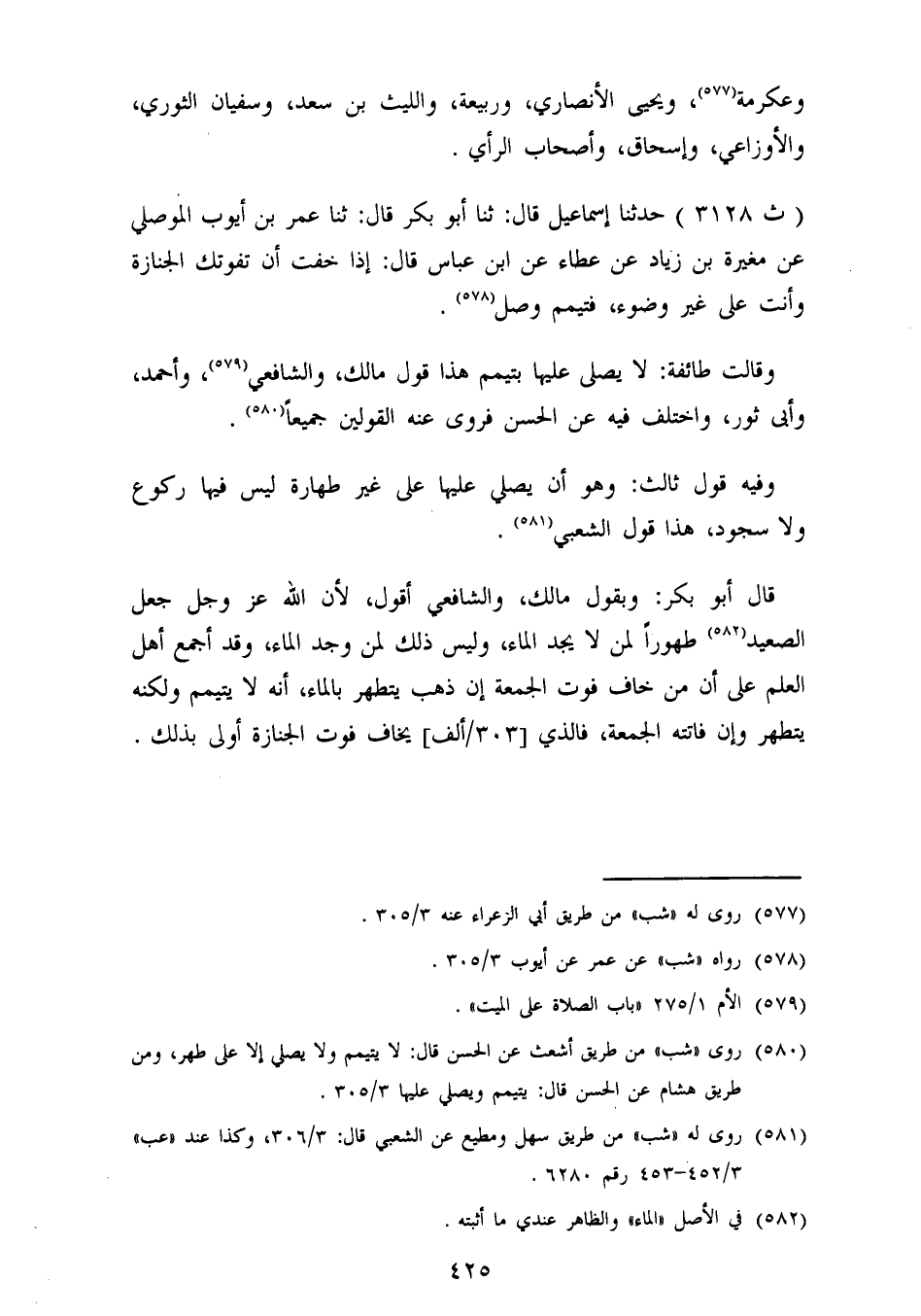 3128 - حَدَّثَنَا إِسْمَاعِيلُ، قَالَ: ثنا أَبُو بَكْرٍ، قَالَ: ثنا عُمَرُ بْنُ أَيُّوبَ الْمَوْصِلِيُّ، عَنْ مُغِيرَةَ بْنِ زِيَادٍ، عَنْ عَطَاءٍ، عَنِ ابْنِ عَبَّاسٍ، قَالَ: «إِذَا خِفْتَ أَنْ تَفُوتَكَ، الْجَنَازَةُ وَأَنْتَ عَلَى غَيْرِ وُضُوءٍ، فَتَيَمَّمْ وَصَلِّ» وَقَالَتْ طَائِفَةٌ: لَا يُصَلَّى عَلَيْهَا بِتَيَمُّمٍ هَذَا قَوْلُ مَالِكٍ وَالشَّافِعِيُّ وَأْحْمَدُ وَأَبِي ثَوْرٍ وَاخْتُلَفَ فِيهِ عَنِ الْحَسَنِ فَرُوِىَ عَنْهُ الْقَوْلَيْنِ جَمِيعًا وَفِيهِ قَوْلٌ ثَالِثٌ: وَهُوَ أَنْ يُصَلَّي عَلَيْهَا عَلَى غَيْرِ طَهَارَةٍ لَيْسَ فِيهَا رُكُوعٌ وَلَا سُجُودٌ، هَذَا قَوْلُ الشَّعْبِيِّ. قَالَ أَبُو بَكْرٍ: وَبُقُولِ مَالِكٍ، وَالشَّافِعِيِّ أَقُولُ: لِأَنَّ اللهَ عَزَّ وَجَلَّ جَعَلَ الصَّعِيدَ طَهُورًا لِمَنْ لَا يَجِدُ الْمَاءَ، وَلَيْسَ ذَلِكَ لِمَنْ وَجَدَ الْمَاءَ، وَقَدْ أَجْمَعَ أَهْلُ الْعِلْمِ عَلَى أَنَّ مَنْ خَافَ فَوْتَ الْجُمُعَةِ إِنْ ذَهَبَ يَتَطَهَّرُ بِالْمَاءِ، أَنَّهُ لَا يَتَيَمَّمُ وَلَكِنَّهُ يَتَطَهَّرُ، وَإِنْ فَاتَتْهُ الْجُمُعَةُ، فَالَّذِي يَخَافُ فَوْتَ الْجَنَازَةِ أَوْلَى بِذَلِكَ