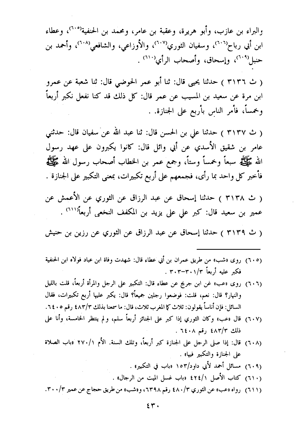 3138 - حَدَّثَنَا إِسْحَاقُ، عَنْ عَبْدِ الرَّزَّاقِ، عَنِ الثَّوْرِيِّ، عَنِ الْأَعْمَشِ، عَنْ عُمَيْرِ بْنِ سَعِيدٍ، قَالَ: «كَبَّرَ عَلِيٌّ عَلَى يَزِيدَ بْنِ الْمُكَفَّفِ النَّخَعِيِّ أَرْبَعًا»