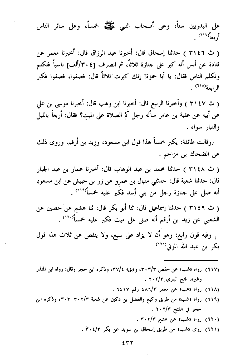 3149 - حَدَّثَنَا إِسْمَاعِيلُ، قَالَ: ثنا أَبُو بَكْرٍ، قَالَ: ثنا هُشَيْمٌ، عَنْ حُصَيْنٍ، عَنِ الشَّعْبِيِّ، عَنْ زَيْدِ بْنِ أَرْقَمَ، «أَنَّهُ صَلَّى عَلَى مَيِّتٍ فَكَبَّرَ عَلَيْهِ خَمْسًا» وَفِيهِ قَوْلٌ رَابِعٌ: وَهُوَ أَنْ لَا يُزَادَ عَلَى سَبْعٍ، وَلَا يَنْقُصَ عَنْ ثَلَاثٍ، هَذَا قَوْلُ بَكْرِ بْنِ عَبْدِ اللهِ الْمُزَنِيِّ. -[433]- وَقَالَ أَحْمَدُ: «لَا يَنْقُصُ مِنْ أَرْبَعٍ، وَلَا يَزِيدُ عَلَى سَبْعٍ» وَفِيهِ قَوْلٌ سَادِسٌ: وَهُوَ أَنْ يُكَبِّرُوا مَا كَبَّرَ إِمَامُهُمْ، رُوِيَ ذَلِكَ عَنِ ابْنِ مَسْعُودٍ، وَكَانَ إِسْحَاقُ يَقُولُ: " إِذَا كَبَّرَ الْإِمَامُ عَلَى الْجَنَازَةِ خَمْسًا أَوْ أَرْبَعًا أَوْ مَا زَادَ إِلَى أَنْ يَبْلُغَ سَبْعًا، لَزِمَ الْمُقْتَدِي بِهِ أَنْ يَنْتَهِيَ إِلَى تَكْبِيرِ الْإِمَامِ. وَفِيهِ قَوْلٌ سَابِعٌ: وَهُوَ أَنْ يُكَبِّرَ سِتًّا، رُوِّينَا عَنْ عَلِيِّ بْنِ أَبِي طَالِبٍ أَنَّهُ صَلَّى عَلَى سَهْلِ بْنِ حُنَيْفٍ فَكَبَّرَ سِتًّا، وَرُوِيَ ذَلِكَ عَنِ ابْنِ مَسْعُودٍ، وَقَدْ رُوِّينَا عَنْ عَلِيِّ بْنِ أَبِي طَالِبٍ أَنَّهُ صَلَّى عَلَى أَبِي قَتَادَةَ فَكَبَّرَ عَلَيْهِ سَبْعًا