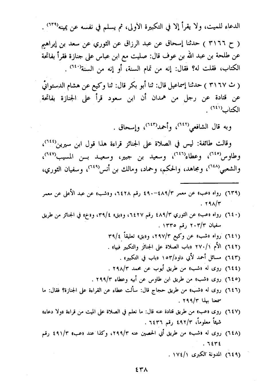 3166 - حَدَّثَنَا إِسْحَاقُ، عَنْ عَبْدِ الرَّزَّاقِ، عَنِ الثَّوْرِيِّ، عَنْ سَعْدِ بْنِ إِبْرَاهِيمَ، عَنْ طَلْحَةَ بْنِ عَبْدِ اللهِ بْنِ عَوْفٍ، قَالَ: " صَلَّيْتُ مَعَ ابْنِ عَبَّاسٍ عَلَى جِنَازَةٍ، فَقَرَأَ بِفَاتِحَةِ الْكِتَابِ، فَقُلْتُ لَهُ؟ فَقَالَ: إِنَّهُ مِنْ تَمَامِ السُّنَّةِ، أَوْ إِنَّهُ مِنَ السُّنَّةِ "