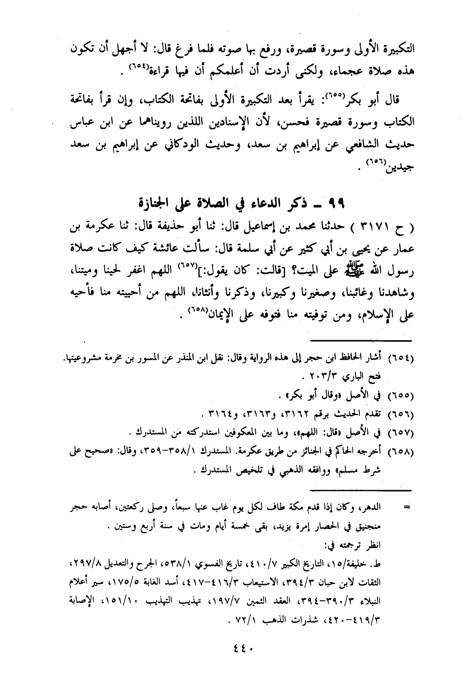 3171 - حَدَّثَنَا مُحَمَّدُ بْنُ إِسْمَاعِيلَ، قَالَ: ثنا أَبُو حُذَيْفَةَ، قَالَ: ثنا عِكْرِمَةُ بْنُ عَمَّارٍ، عَنْ يَحْيَى بْنِ أَبِي كَثِيرٍ، عَنْ أَبِي سَلَمَةَ، قَالَ: سَأَلْتُ عَائِشَةَ كَيْفَ كَانَتْ صَلَاةُ رَسُولِ اللهِ صَلَّى اللَّهُ عَلَيْهِ وَسَلَّمَ عَلَى الْمَيِّتِ؟ قَالَتْ: كَانَ يَقُولُ: «اللهُمَّ اغْفِرْ لِحَيِّنَا وَمَيِّتِنَا، وَشَاهِدِنَا وَغَائِبِنَا، وَصَغِيرِنَا وَكَبِيرِنَا، وَذَكَرِنَا وَأُنْثَانَا، اللهُمَّ مَنْ أَحْيَيْتَهُ مِنَّا فَأَحْيِهِ عَلَى الْإِسْلَامِ، وَمَنْ تَوَفَّيْتَهُ مِنَّا فَتَوَفَّهُ عَلَى الْإِيمَانِ» -[441]- وَبِهِ قَالَ سُفْيَانُ الثَّوْرِيُّ