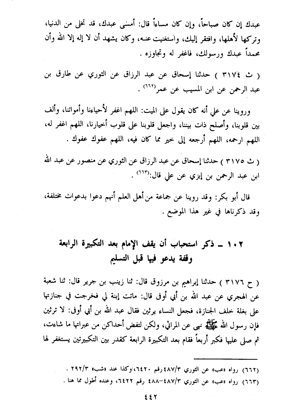 3176 - حَدَّثَنَا إِبْرَاهِيمُ بْنُ مَرْزُوقٍ، قَالَ: ثنا وَهْبُ بْنُ جَرِيرٍ، قَالَ: ثنا شُعْبَةُ، عَنِ الْهَجَرِيِّ، عَنْ عَبْدِ اللهِ بْنِ أَبِي أَوْفَى، قَالَ: " مَاتَتِ ابْنَةٌ لِي فَخَرَجْتُ فِي جِنَازَتِهَا عَلَى بَغْلَةٍ خَلْفَ الْجِنَازَةِ، فَجَعَلَ النِّسَاءُ يَرْثِينَ، فَقَالَ عَبْدُ اللهِ بْنُ أَبِي أَوْفَى: لَا تَرْثِينَ فَإِنَّ رَسُولَ اللهِ صَلَّى اللَّهُ عَلَيْهِ وَسَلَّمَ نَهَى عَنِ الْمَرَاثِي، وَلَكِنْ لِتُفْضِ إِحْدَاكُنَّ مِنْ عَبَرَاتِهَا مَا شَاءَتْ، ثُمَّ صَلَّى عَلَيْهَا فَكَبَّرَ أَرْبَعًا، فَقَامَ بَعْدَ التَّكْبِيرَةِ الرَّابِعَةِ كَقَدْرِ بَيْنَ التَّكْبِيرَتَيْنِ يَسْتَغْفِرُ لَهَا، -[443]- وَيَدْعُو، وَقَالَ: هَكَذَا كَانَ رَسُولُ اللهِ صَلَّى اللَّهُ عَلَيْهِ وَسَلَّمَ يَصْنَعُ " وَكَانَ أَحْمَدُ بْنُ حَنْبَلٍ يَرَى أَنْ يَقِفَ بَعْدَ الرَّابِعَةِ قَبْلَ التَّسْلِيمِ، فَاحْتَجَّ بِهَذَا الْحَدِيثِ، وَقَالَ: لَا أَعْرِفُ شَيْئًا يُخَالِفُهُ، وَاسْتَحَبَّ ذَلِكَ إِسْحَاقُ بْنُ رَاهَوَيْهِ وَقَدِ اخْتُلِفَ فِي الدُّعَاءِ عَلَى الْمَيِّتِ، فَكَانَ سُفْيَانُ الثَّوْرِيُّ يَقُولُ: بِحَدِيثِ عَائِشَةَ، وَذَكَرَ إِسْحَاقُ الدُّعَاءَ الَّذِي فِي حَدِيثِ عَائِشَةَ، فَقَالَ: «إِنْ دَعَا بِهِ فَهُوَ أَحَبُّ إِلَيْنَا»