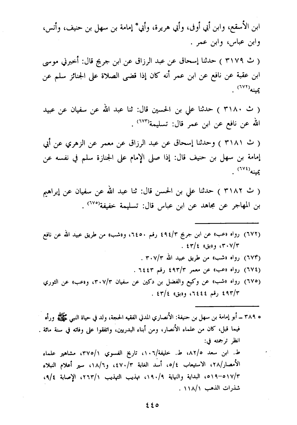 3181 - وَحَدَّثَنَا إِسْحَاقُ، عَنْ عَبْدِ الرَّزَّاقِ، عَنْ مَعْمَرٍ، عَنِ الزُّهْرِيِّ، عَنْ أَبِي أُمَامَةَ بْنِ سَهْلِ بْنِ حُنَيْفٍ، قَالَ: «إِذَا صَلَّى الْإِمَامُ عَلَى الْجِنَازَةِ سَلَّمَ فِي نَفْسِهِ عَنْ يَمِينِهِ»