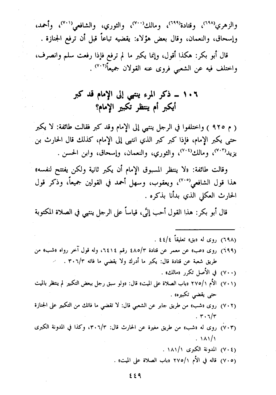ذَكْرُ الْمَرْءِ يَنْتَهِي إِلَى الْإِمَامِ قَدْ كَبَّرَ أَيُكَبِّرُ أَمْ يَنْتَظِرُ تَكْبِيرَ الْإِمَامِ؟ وَاخْتَلَفُوا فِي الرَّجُلِ يَنْتَهِي إِلَى الْإِمَامِ وَقَدْ كَبَّرَ، فَقَالَتْ طَائِفَةٌ: لَا يُكَبِّرُ حَتَّى يُكَبِّرَ الْإِمَامُ، فَإِذَا كَبَّرَ كَبَّرَ الَّذِي انْتَهَى إِلَى الْإِمَامِ، كَذَلِكَ قَالَ الْحَارِثُ بْنُ يَزِيدَ، وَمَالِكٌ، وَالثَّوْرِيُّ، وَالنُّعْمَانُ، وَإِسْحَاقُ، وَابْنُ الْحَسَنِ. وَقَالَتْ طَائِفَةٌ: لَا يَنْتَظِرُ الْمَسْبُوقُ الْإِمَامَ أَنْ يُكَبِّرَ ثَانِيَةً، وَلَكِنْ يَفْتَتِحُ لِنَفْسِهِ، هَذَا قَوْلُ الشَّافِعِيِّ، وَيَعْقُوبَ، وَسَهْلِ بْنِ أَحْمَدَ، فِي الْقَوْلَيْنِ جَمِيعًا، وَذَكَرَ قَوْلَ الْحَارِثِ الْعُكْلِيِّ الَّذِي بَدَأْنَا بِذِكْرِهِ قَالَ أَبُو بَكْرٍ: هَذَا الْقَوْلُ أَحَبُّ إِلَيَّ قِيَاسًا عَلَى الرَّجُلِ يَنْتَهِي فِي الصَّلَاةِ الْمَكْتُوبَةِ -[450]- إِلَى الْإِمَامِ وَقَدْ كَبَّرَ، يُكَبِّرُ مَعَهُ وَلَا يَنْتَظِرُ تَكْبِيرَهُ