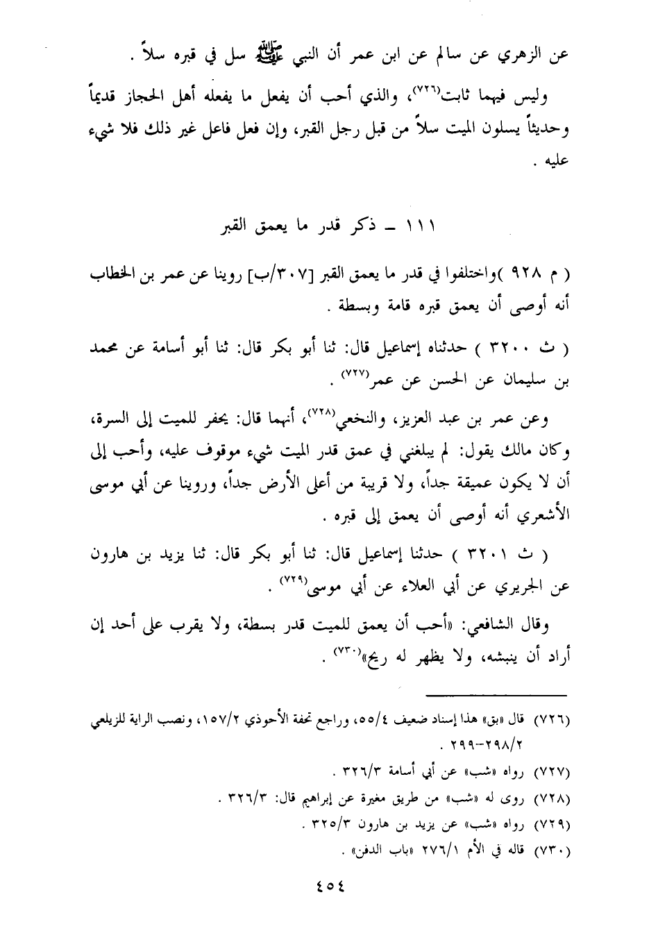 3201 - حَدَّثَنَا إِسْمَاعِيلُ، قَالَ: ثنا أَبُو بَكْرٍ، قَالَ: ثنا يَزِيدُ بْنُ هَارُونَ، عَنِ الْجُرَيْرِيِّ، عَنْ أَبِي الْعَلَاءِ، عَنْ أَبِي مُوسَى وَقَالَ الشَّافِعِيُّ: «أُحِبُّ أَنْ يُعَمَّقَ، لِلْمَيِّتِ قَدْرَ بَسْطَةٍ، وَلَا يَقْرُبَ عَلَى أَحَدٍ إِنْ أَرَادَ أَنْ يَنْبُشَهُ، وَلَا يَظْهَرَ لَهُ رِيحٌ»