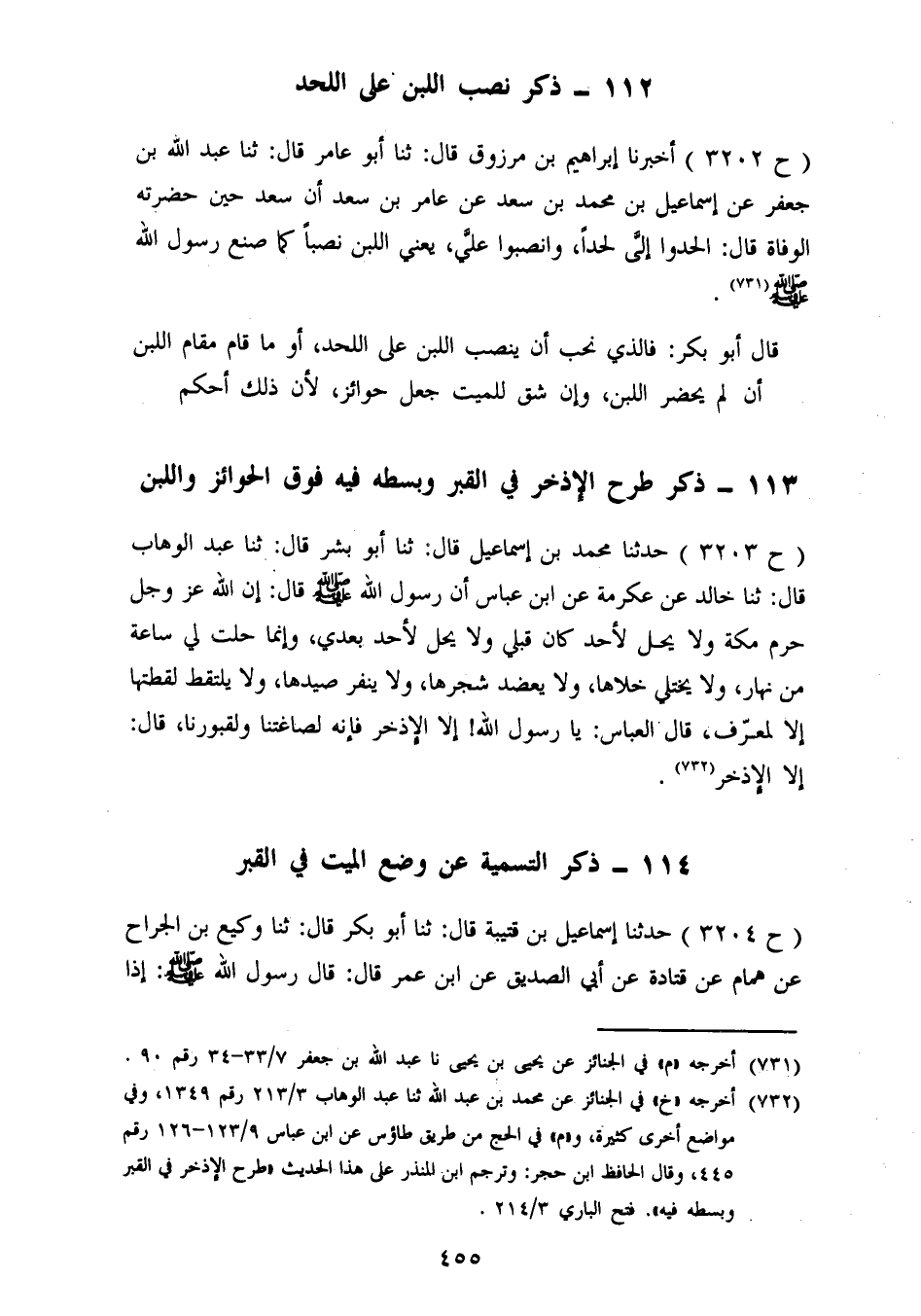 3202 - أَخْبَرَنَا إِبْرَاهِيمُ بْنُ مَرْزُوقٍ، قَالَ: ثنا أَبُو عَامِرٍ، قَالَ: ثنا عَبْدُ اللهِ بْنُ جَعْفَرٍ، عَنْ إِسْمَاعِيلَ بْنِ مُحَمَّدِ بْنِ سَعْدٍ، عَنْ عَامِرِ بْنِ سَعْدٍ، أَنَّ سَعْدَ، حِينَ حَضَرَتْهُ الْوَفَاةُ، قَالَ: «الْحَدُوا إِلَيَّ لَحْدًا، وَانْصِبُوا عَلَيَّ، يَعْنِي اللَّبِنَ، نَصَبًا كَمَا صَنَعَ رَسُولُ اللهِ صَلَّى اللَّهُ عَلَيْهِ وَسَلَّمَ» قَالَ أَبُو بَكْرٍ: فَالَّذِي نُحِبُّ أَنْ يُنْصَبَ اللَّبِنُ عَلَى اللَّحْدِ، أَوْ مَا قَامَ مَقَامَ اللَّبِنِ إِنْ لَمْ يَحْضُرِ اللَّبِنُ، وَإِنْ شُقَّ لِلْمَيِّتِ جُعِلَ حَوَائِزُ، لِأَنَّ ذَلِكَ أَحْكُمُ