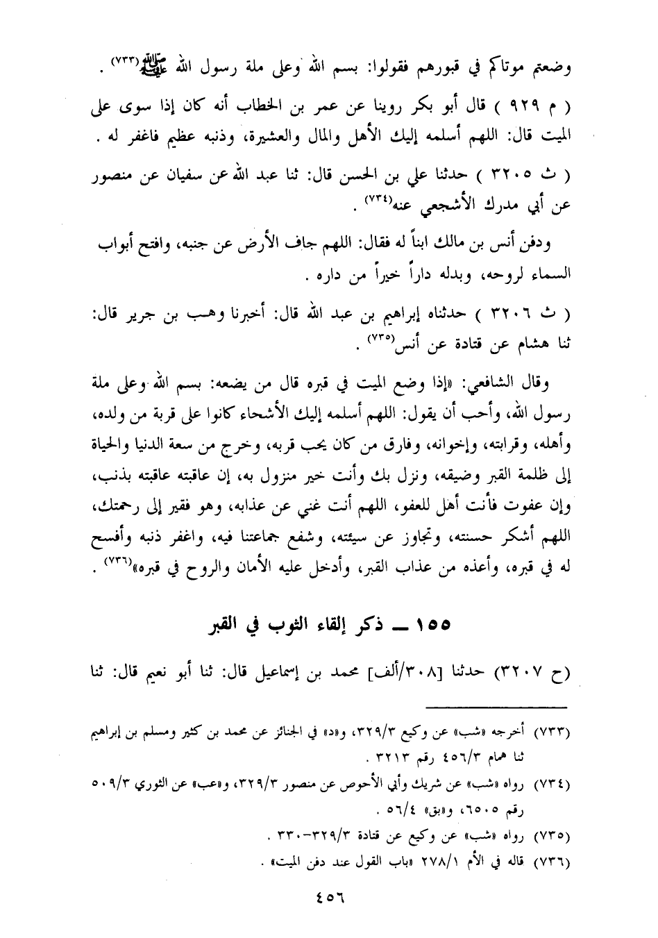 3206 - حَدَّثَنَاهُ إِبْرَاهِيمُ بْنُ عَبْدِ اللهِ، قَالَ: أَخْبَرَنَا وَهْبُ بْنُ جَرِيرٍ، قَالَ: ثنا هِشَامٌ، عَنْ قَتَادَةَ، عَنْ أَنَسٍ وَقَالَ الشَّافِعِيُّ: " إِذَا وُضِعَ الْمَيِّتُ فِي قَبْرِهِ، قَالَ مَنْ يَضَعُهُ: بِسْمِ اللهِ وَعَلَى مِلَّةِ رَسُولِ اللهِ، وَأُحِبُّ أَنْ يَقُولَ: اللهُمَّ أَسْلَمَهُ إِلَيْكَ الْأَشِحَّاءُ، كَانُوا عَلَى قُرْبَةٍ مِنْ وَلَدِهِ، وَأَهْلِهِ، وَقَرَابَتِهِ، وَإِخْوَانِهِ، وَفَارَقَ مَنْ كَانَ يُحِبُّ قُرْبَهُ، وَخَرَجَ مِنْ سَعَةِ الدُّنْيَا وَالْحَيَاةِ إِلَى ظُلْمَةِ الْقَبْرِ وَضِيقِهِ، وَنَزَلَ بِكَ وَأَنْتَ خَيْرُ مَنْزُولٍ بِهِ، إِنْ عَاقَبْتَهُ عَاقَبْتَهُ بِذَنْبٍ، وَإِنْ عَفَوْتَ فَأَنْتَ أَهْلٌ لِلْعَفْوِ، اللهُمَّ أَنْتَ غَنِيُّ عَنْ عَذَابِهِ، وَهُوَ فَقِيرٌ إِلَى رَحْمَتِكَ، اللهُمَّ اشْكُرْ حَسَنَتَهُ، وَتَجَاوَزْ عَنْ سَيِّئَتِهِ، وَشَفِّعْ جَمَاعَتَنَا فِيهِ، وَاغْفِرْ ذَنْبَهُ وَأَفْسِحْ لَهُ فِي قَبْرِهِ، وَأَعِذْهُ مِنْ عَذَابِ الْقَبْرِ، وَأَدْخِلْ عَلَيْهِ الْأَمَانَ وَالرَّوْحَ فِي قَبْرِهِ