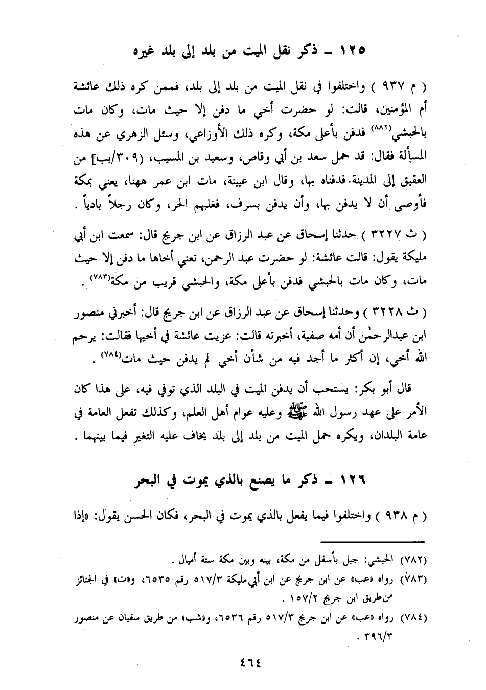 3228 - وَحَدَّثَنَا إِسْحَاقُ، عَنْ عَبْدِ الرَّزَّاقِ، عَنِ ابْنِ جُرَيْجٍ، قَالَ: أَخْبَرَنِي مَنْصُورُ بْنُ عَبْدِ الرَّحْمَنِ، أَنَّ أُمَّهُ صَفِيَّةَ أَخْبَرَتْهُ، قَالَتْ: عَزَّيْتُ عَائِشَةَ فِي أَخِيهَا، فَقَالَتْ: «يَرْحَمُ اللهُ أَخِي، إِنَّ أَكْثَرَ مَا أَجِدُ فِيهِ مِنْ شَأْنِ أَخِي لَمْ يُدْفَنْ حَيْثُ مَاتَ» قَالَ أَبُو بَكْرٍ: يُسْتَحَبُّ أَنْ يُدْفَنَ الْمَيِّتُ فِي الْبَلَدِ الَّذِي تُوُفِّيَ فِيهِ، عَلَى هَذَا كَانَ الْأَمْرُ عَلَى عَهْدِ رَسُولِ اللهِ صَلَّى اللَّهُ عَلَيْهِ وَسَلَّمَ وَعَلَيْهِ عَوَامُ أَهْلِ الْعِلْمِ، وَكَذَلِكَ تَفْعَلُ الْعَامَّةُ فِي عَامَّةِ الْبُلْدَانِ، وَيُكْرَهُ حَمْلُ الْمَيِّتِ مِنْ بَلَدٍ إِلَى بَلَدٍ يُخَافُ عَلَيْهِ التَّغَيُّرُ فِيمَا بَيْنَهُمَا