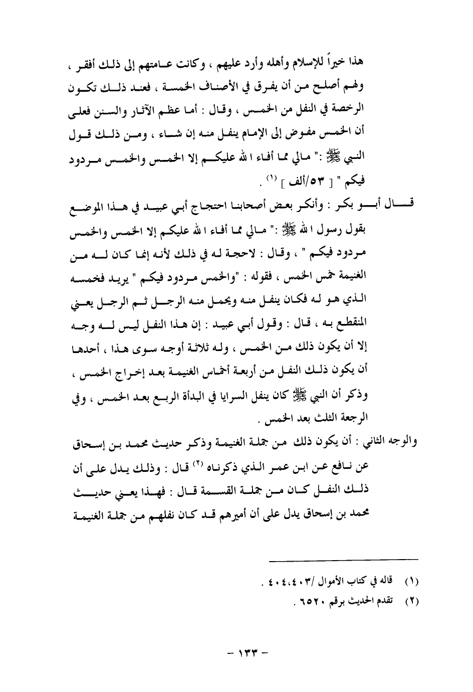 هَذَا خَيْرًا لِلْإِسْلَامِ، وَأَهْلِهِ وَأَرَدَّ عَلَيْهِمْ، وَكَانَتْ عَامَّتُهُمْ إِلَى ذَلِكَ أَفْقَرُ، وَلَهُمْ أَصْلَحُ مِنْ أَنْ يُفَرَّقَ فِي الْأَصْنَافِ الْخَمْسَةِ، فَعِنْدَ ذَلِكَ تَكُونُ الرُّخْصَةُ فِي النَّفَلِ مِنَ الْخُمُسِ وَقَالَ: أَمَّا مُعْظَمُ الْآثَارِ وَالسُّنَنِ فَعَلَى أَنَّ الْخُمُسَ مُفَوَّضٌ إِلَى الْإِمَامِ يُنَفِّلُ مِنْهُ إِنْ شَاءَ، وَمَنْ ذَلِكَ قَوْلُ رَسُولِ اللهِ صَلَّى اللَّهُ عَلَيْهِ وَسَلَّمَ: «مَالِي مِمَّا أَفَاءَ اللهُ عَلَيْكُمْ إِلَّا الْخُمُسُ، وَالْخُمُسُ مَرْدُودٌ فِيكُمْ» قَالَ أَبُو بَكْرٍ: وَأَنْكَرَ بَعْضُ أَصْحَابِنَا احْتِجَاجَ أَبِي عُبَيْدٍ فِي هَذَا الْمَوْضِعِ بِقَوْلِ رَسُولِ اللهِ صَلَّى اللَّهُ عَلَيْهِ وَسَلَّمَ: «مَالِي مِمَّا أَفَاءَ اللهُ عَلَيْكُمْ إِلَّا الْخُمُسُ، وَالْخُمُسُ مَرْدُودٌ عَلَيْكُمْ» ، وَقَالَ: لَا حُجَّةَ لَهُ فِي ذَلِكَ، لِأَنَّهُ إِنَّمَا كَانَ لَهُ مِنَ الْغَنِيمَةِ خُمُسِ الْخُمُسِ، فَقَوْلُهُ: «وَالْخُمُسُ مَرْدُودٌ فِيكُمْ» يُرِيدُ فَخُمُسُهُ الَّذِي هُوَ لَهُ، فَكَانَ يُنَفِّلُ مِنْهُ، وَيَحْمِلُ مِنْهُ الرَّجُلُ، ثُمَّ الرَّجُلُ، يَعْنِي الْمُنْقَطِعَ بِهِ قَالَ: وَقَوْلُ أَبِي عُبَيْدٍ: إِنَّ هَذَا النَّفَلُ لَيْسَ لَهُ وَجْهٌ إِلَّا أَنْ يَكُونَ ذَلِكَ مِنَ الْخُمُسِ، وَلَهُ ثَلَاثَةُ أَوْجُهٍ سِوَى هَذَا، أَحَدُهَا أَنْ يَكُونَ ذَلِكَ النَّفَلُ مِنْ أَرْبَعَةِ أَخْمَاسِ الْغَنِيمَةِ بَعْدَ إِخْرَاجِ الْخُمُسِ، وَذُكِرَ أَنَّ رَسُولَ اللهِ صَلَّى اللَّهُ عَلَيْهِ وَسَلَّمَ كَانَ يُنَفِّلُ السَّرَايَا فِي الْبَدْأَةِ الرُّبُعَ بَعْدَ الْخُمُسِ، وَفِي الرَّجْعَةِ الثُّلُثَ بَعْدَ الْخُمُسِ. وَالْوَجْهُ الثَّانِي: أَنْ يَكُونَ ذَلِكَ مِنْ جُمْلَةِ الْغَنِيمَةِ، وَذَكَرَ حَدِيثَ مُحَمَّدِ بْنِ إِسْحَاقَ، عَنْ نَافِعٍ، عَنِ ابْنِ عُمَرَ الَّذِي ذَكَرْنَاهُ قَالَ: وَذَلِكَ يَدُلُّ عَلَى أَنَّ ذَلِكَ النَّفَلُ كَانَ مِنْ جُلَّةِ الْقِسْمَةِ قَالَ: فَهَذَا يَعْنِي حَدِيثَ مُحَمَّدِ بْنِ إِسْحَاقَ يَدُلُّ عَلَى أَنَّ أَمِيرَهُمْ قَدْ كَانَ نَفَّلَهُمْ مِنْ جُمْلَةِ الْغَنِيمَةِ