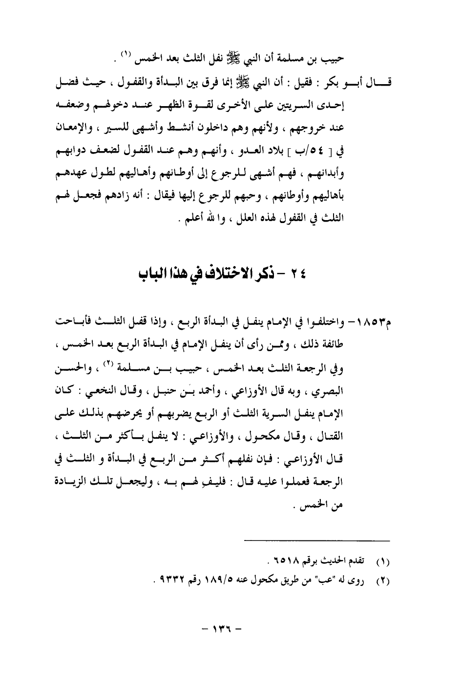 ذِكْرُ الِاخْتِلَافِ فِي هَذَا الْبَابِ وَاخْتَلَفُوا فِي الْإِمَامِ يُنَفِّلُ فِي الْبَدْأَةِ الرُّبُعَ، وَإِذَا قَفَلَ الثُّلُثَ، فَأَبَاحَتْ طَائِفَةٌ ذَلِكَ، وَمِمَّنْ رَأَى أَنْ يُنَفِّلَ الْإِمَامُ فِي الْبَدْأَةِ الرُّبُعَ بَعْدَ الْخُمُسِ، وَفِي الرَّجْعَةِ الثُّلُثَ بَعْدَ الْخُمُسِ حَبِيبُ بْنُ مَسْلَمَةَ، وَالْحَسَنُ الْبَصْرِيُّ، وَبِهِ قَالَ الْأَوْزَاعِيُّ، وَأَحْمَدُ بْنُ حَنْبَلٍ، وَقَالَ النَّخَعِيُّ: كَانَ الْإِمَامُ يُنَفِّلُ السَّرِيَّةَ الثُّلُثَ، أَوِ الرُّبُعَ يَضْرِبُهُمْ، أَوْ يُحَرِّضُهُمْ بِذَلِكَ عَلَى الْقِتَالِ، وَقَالَ مَكْحُولٌ، وَالْأَوْزَاعِيُّ: لَا يُنَفِّلُ بِأَكْثَرَ مِنَ الثُّلُثِ، قَالَ الْأَوْزَاعِيُّ: فَإِنْ نَفَّلَهُمْ أَكْثَرَ مِنَ الرُّبُعِ فِي الْبَدْأَةِ، وَالثُّلُثِ فِي الرَّجْعَةِ فَعَمِلُوا عَلَيْهِ قَالَ: فَلْيَفِ لَهُمْ بِهِ، وَلْيَجْعَلْ تِلْكَ الزِّيَادَةَ مِنَ الْخُمُسِ