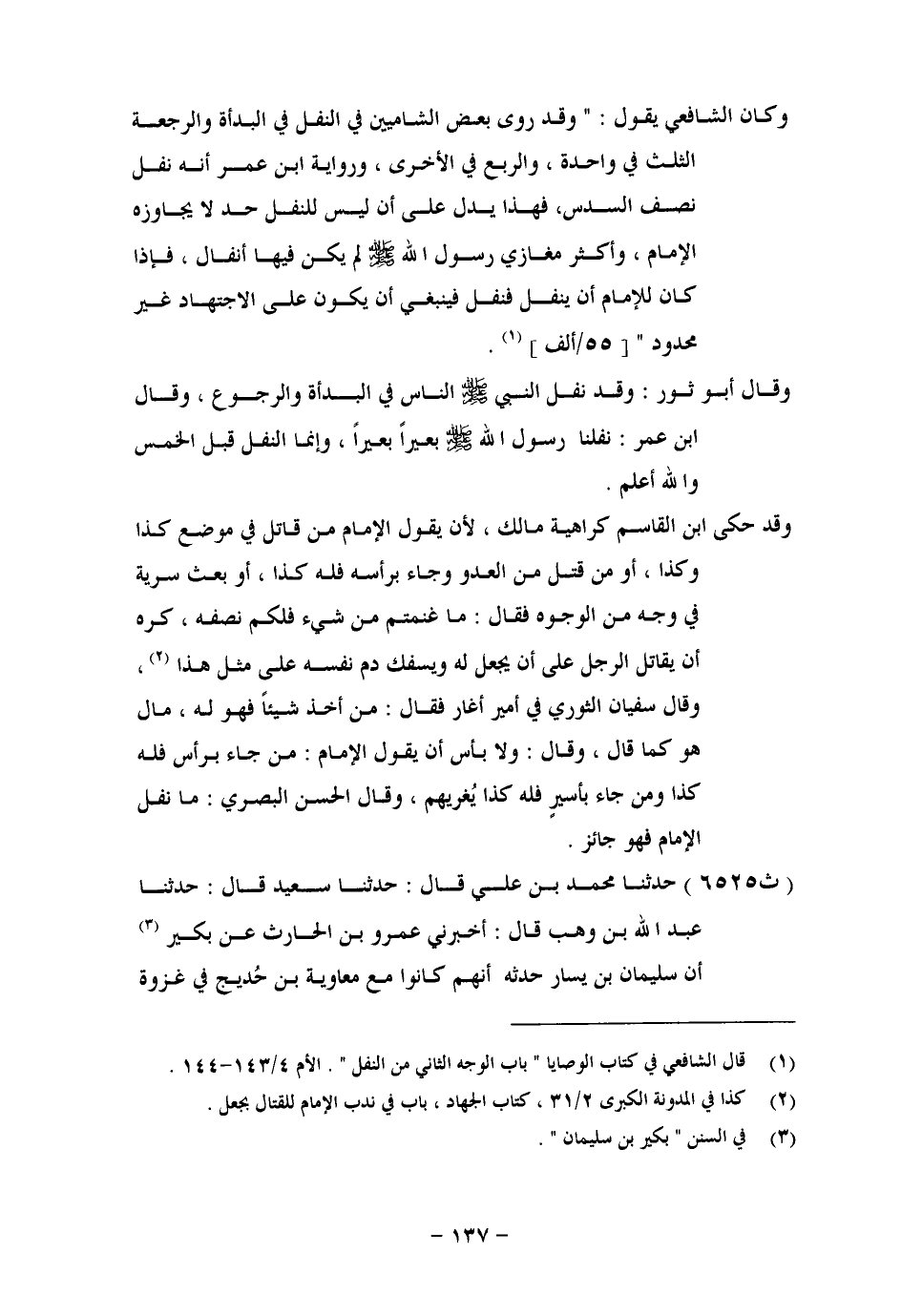 وَكَانَ الشَّافِعِيُّ يَقُولُ: وَقَدْ رَوَى بَعْضُ الشَّامِيِّينَ فِي النَّفَلِ فِي الْبَدْأَةِ وَالرَّجْعَةِ الثُّلُثَ فِي وَاحِدَةٍ، وَالرُّبُعَ فِي الْأُخْرَى، وَرِوَايَةِ ابْنِ عُمَرَ أَنَّهُ نَفَّلَ نِصْفَ السُّدُسِ، فَهَذَا يَدُلُّ عَلَى أَنْ لَيْسَ لِلنَّفَلِ حَدٌّ لَا يُجَاوِزُهُ الْإِمَامُ، وَأَكْثَرُ مَغَازِي رَسُولِ اللهِ صَلَّى اللَّهُ عَلَيْهِ وَسَلَّمَ لَمْ يَكُنْ فِيهَا أَنْفَالٌ، فَإِذَا كَانَ لِلْإِمَامِ أَنْ يُنَفِّلَ، فَيَنْبَغِي أَنْ يَكُونَ عَلَى الِاجْتِهَادِ غَيْرَ مَحْدُودٍ وَقَالَ أَبُو ثَوْرٍ: وَقَدْ نَفَّلَ رَسُولُ اللهِ صَلَّى اللَّهُ عَلَيْهِ وَسَلَّمَ النَّاسَ فِي الْبَدْأَةِ، وَالرُّجُوعِ، وَقَالَ ابْنُ عُمَرَ: نَفَّلَنَا رَسُولُ اللهِ صَلَّى اللَّهُ عَلَيْهِ وَسَلَّمَ بَعِيرًا، بَعِيرًا، وَإِنَّمَا النَّفَلُ قَبْلَ الْخُمُسِ، وَاللهُ أَعْلَمُ. وَقَدْ حَكَى ابْنُ الْقَاسِمِ كَرَاهِيَةَ مَالِكٍ أَنْ يَقُولَ الْإِمَامُ: مَنْ قَاتَلَ فِي مَوْضِعِ كَذَا، وَكَذَا، أَوْ مَنْ قَتَلَ مِنَ الْعَدُوِّ، وَجَاءَ بِرَأْسِهِ، فَلَهُ كَذَا، أَوْ بَعْضَ سَرِيَّةٍ فِي وَجْهٍ مِنَ الْوُجُوهِ، فَقَالَ: مَا غَنِمْتُمْ مِنْ شَيْءٍ فَلَكُمْ نِصْفَهُ، كَرِهَ أَنْ يُقَاتِلَ الرَّجُلُ عَلَى أَنْ يُجْعَلَ لَهُ وَيَسْفِكَ دَمَ نَفْسِهِ عَلَى مِثْلِ هَذَا. وَقَالَ سُفْيَانُ الثَّوْرِيُّ فِي أَمِيرٍ أَغَارَ فَقَالَ: مَنْ أَخَذَ شَيْئًا، فَهُوَ لَهُ مَالٌ هُوَ كَمَا قَالَ: وَقَالَ: وَلَا بَأْسَ أَنْ يَقُولَ الْإِمَامُ: مَنْ جَاءَ بِرَأْسٍ فَلَهُ كَذَا، وَمَنْ جَاءَ بِأَسِيرٍ فَلَهُ كَذَا يُغْرِيهِمْ، وَقَالَ الْحَسَنُ الْبَصْرِيُّ: مَا نَفَّلَ الْإِمَامُ فَهُوَ جَائِزٌ