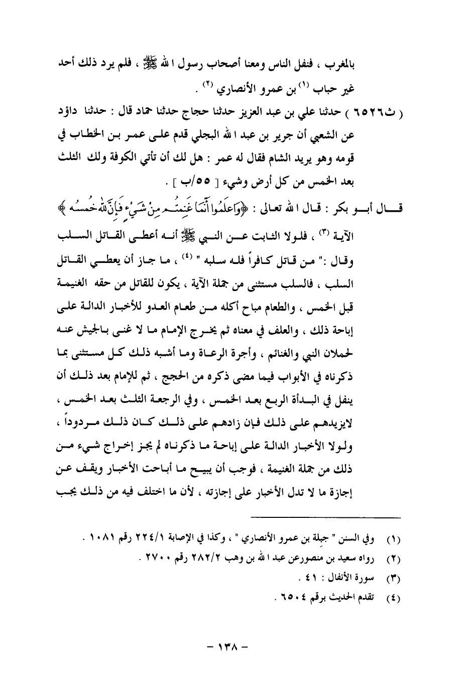 6526 - حَدَّثَنَا عَلِيُّ بْنُ عَبْدِ الْعَزِيزِ، حَدَّثَنَا حَجَّاجٌ، حَدَّثَنَا حَمَّادٌ، قَالَ: حَدَّثَنَا دَاوُدُ، عَنِ الشَّعْبِيِّ، أَنَّ جَرِيرَ بْنَ عَبْدِ اللهِ الْبَجَلِيَّ، قَدِمَ عَلَى عُمَرَ بْنِ الْخَطَّابِ فِي قَوْمِهِ، وَهُوَ يُرِيدُ الشَّامَ، فَقَالَ لَهُ عُمَرُ: هَلْ لَكَ أَنْ تَأْتِيَ الْكُوفَةَ، وَلَكَ الثُّلُثُ بَعْدَ الْخُمُسِ مِنْ كُلِّ أَرْضٍ وَشَيْءٍ قَالَ أَبُو بَكْرٍ: فَقَالَ اللهُ تَعَالَى: {وَاعْلَمُوا أَنَّمَا غَنِمْتُمْ مِنْ شَيْءٍ فَأَنَّ لِلَّهِ خُمُسَهُ} [الأنفال: 41] الْآيَةَ، فَلَوْلَا الثَّابِتُ عَنْ رَسُولِ اللهِ صَلَّى اللَّهُ عَلَيْهِ وَسَلَّمَ أَنَّهُ أَعْطَى الْقَاتِلَ السَّلَبَ، وَقَالَ: «مَنْ قَاتَلَ كَافِرًا، فَلَهُ سَلَبُهُ» ، مَا جَازَ أَنْ يُعْطَى الْقَاتِلُ السَّلَبَ، فَالسَّلَبُ مُسْتَثْنًى مِنْ جُمْلَةِ الْآيَةِ يَكُونُ لِلْقَاتِلِ مِنْ حَقِّهِ الْغَنِيمَةُ قَبْلَ الْخُمُسِ، وَالطَّعَامُ مُبَاحٌ أَكْلُهُ مِنْ طَعَامِ الْعَدُوِّ لِلْأَخْبَارِ الدَّالَّةِ عَلَى إِبَاحَةِ ذَلِكَ، وَالْعَلَفُ فِي مَعْنَاهُ، ثُمَّ يُخْرِجُ الْإِمَامُ مَا لَا غِنًى بِالْجَيْشِ عَنْهُ لِحِمْلَانِ النَّبِيِّ، وَالْغَنَائِمِ وَأُجْرَةِ الرُّعَاةِ، وَمَا أَشْبَهَ ذَلِكَ كُلٌّ مُسْتَثْنًى بِمَا ذَكَرْنَاهُ فِي الْأَبْوَابِ فِيمَا مَضَى ذِكْرُهُ مِنَ الْحُجَجِ، ثُمَّ لِلْإِمَامِ بَعْدَ ذَلِكَ أَنْ يُنَفِّلَ فِي الْبَدْأَةِ الرُّبُعَ بَعْدَ الْخُمُسِ، وَفِي الرَّجْعَةِ الثُّلُثَ بَعْدَ الْخُمُسِ، لَا يَزِيدُهُمْ عَلَى ذَلِكَ، فَإِنْ زَادَهُمْ عَلَى ذَلِكَ كَانَ ذَلِكَ مَرْدُودًا. وَلَوْلَا الْأَخْبَارُ الدَّالَّةُ عَلَى إِبَاحَةِ مَا ذَكَرْنَاهُ، لَمْ يَجُزْ إِخْرَاجُ شَيْءٍ مِنْ ذَلِكَ مِنْ جُمْلَةِ الْغَنِيمَةِ، فَوَجَبَ أَنْ يُبِيحَ مَا أَبَاحَتِ الْأَخْبَارُ، وَيَقِفُ عَنْ إِجَازَةِ مَا لَا تَدُلُّ الْأَخْبَارُ عَلَى إِجَازَتِهِ، لِأَنَّ مَا اخْتُلِفَ فِيهِ مِنْ ذَلِكَ يَجِبُ -[139]- رَدُّهُ إِلَى قَوْلِهِ: {وَاعْلَمُوا أَنَّمَا غَنِمْتُمْ مِنْ شَيْءٍ فَأَنَّ لِلَّهِ خُمُسَهُ} [الأنفال: 41] الْآيَةَ. وَلَوْ أَعْطَى إِمَامٌ شَيْئًا مِنَ الْغَنِيمَةَ أَحَدًا غَيْرَ مَا ذَكَرْنَاهُ كَانَ ذَلِكَ مَرْدُودًا، وَلَمْ يَطَبْ ذَلِكَ لِأَحَدٍ أُعْطِيَهُ، بَلْ عَلَيْهِ رَدُّهُ إِلَى جُمْلَةِ الْغَنَائِمِ، إِنْ لَمْ يَكُنِ اسْتَهْلَكَهُ، فَإِنْ كَانَ اسْتَهْلَكَهُ، فَعَلَيْهِ مِثْلُهُ، إِنْ كَانَ لَهُ مِثْلٌ، أَوْ قِيمَةٌ إِنْ لَمْ يَكُنْ لَهُ مِثْلٌ، وَإِنْ كَانَ الْمُعْطَى مِمَّنْ لَا يُوصَلُ إِلَى أَخْذِ الشَّيْءِ مِنْهُ، وَجَبَ عَلَى الْإِمَامِ غُرْمُهُ، يَدُلُّ عَلَى ذَلِكَ قَوْلُ رَسُولِ اللهِ صَلَّى اللَّهُ عَلَيْهِ وَسَلَّمَ: «أَدُّوا الْخِيَاطَ، وَالْمَخِيطَ، وَإِيَّاكُمْ وَالْغُلُولَ، فَإِنَّهُ عَارٌ عَلَى أَهْلِهِ يَوْمَ الْقِيَامَةِ»