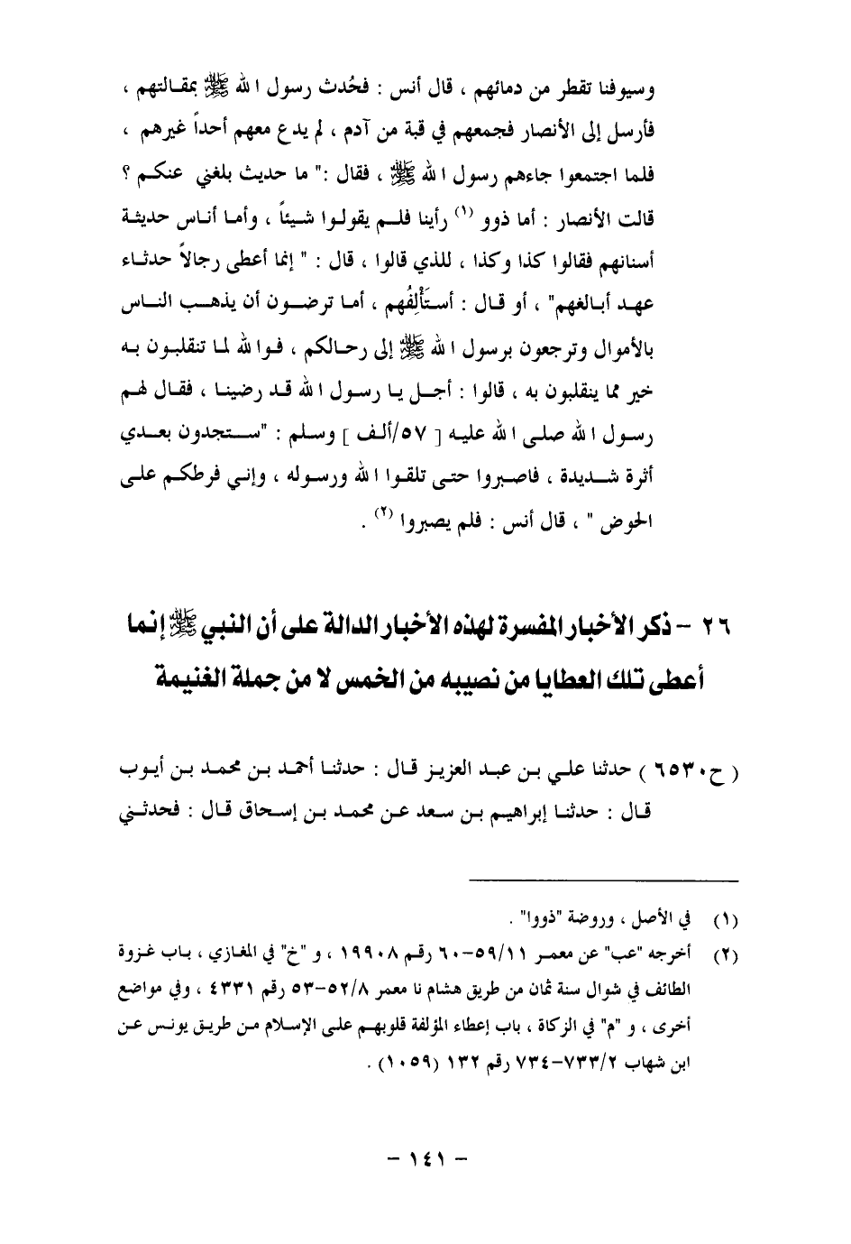 ذِكْرُ الْأَخْبَارِ الْمُفَسِّرَةِ لِهَذِهِ الْأَخْبَارِ الدَّالَّةِ عَلَى أَنَّ رَسُولَ اللهِ صَلَّى اللَّهُ عَلَيْهِ وَسَلَّمَ إِنَّمَا أَعْطَى تِلْكَ الْعَطَايَا مِنْ نَصِيبِهِ مِنَ الْخُمُسِ، لَا مِنْ جُمْلَةِ الْغَنِيمَةِ