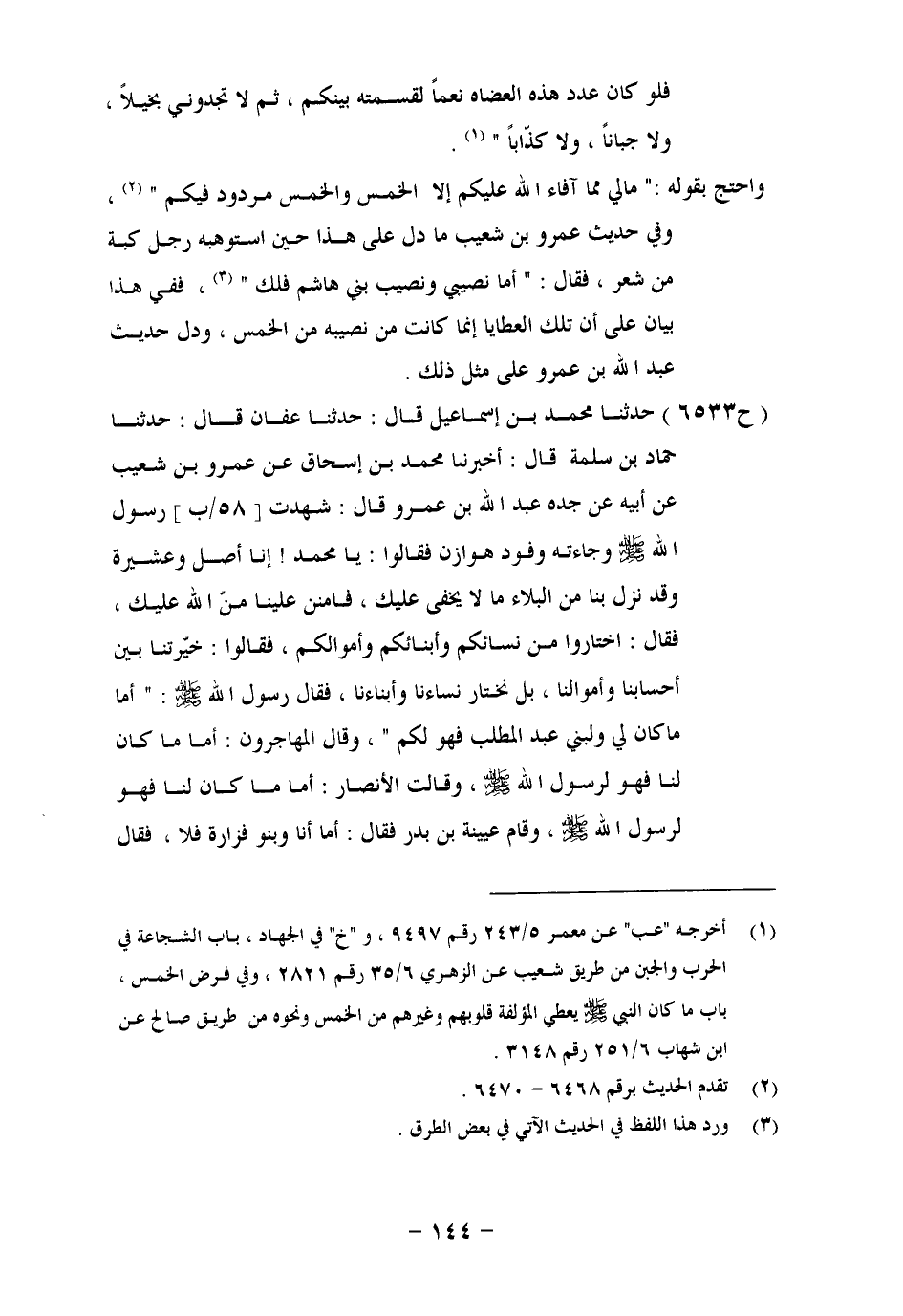 6533 - حَدَّثَنَا مُحَمَّدُ بْنُ إِسْمَاعِيلَ، قَالَ: حَدَّثَنَا عَفَّانُ، قَالَ: حَدَّثَنَا حَمَّادُ بْنُ سَلَمَةَ، قَالَ: أَخْبَرَنَا مُحَمَّدُ بْنُ إِسْحَاقَ، عَنْ عَمْرِو بْنِ شُعَيْبٍ، عَنْ أَبِيهِ، عَنْ جَدِّهِ عَبْدِ اللهِ بْنِ عَمْرٍو، قَالَ: شَهِدْتُ رَسُولَ اللهِ صَلَّى اللَّهُ عَلَيْهِ وَسَلَّمَ وَجَاءَتْهُ وُفُودُ هَوَزَانَ، فَقَالُوا: يَا مُحَمَّدُ إِنَّا أَصْلٌ وَعَشِيرَةٌ، وَقَدْ نَزَلَ بِنَا مِنَ الْبَلَاءِ مَا لَا يَخْفَى عَلَيْكَ، فَامْنُنْ عَلَيْنَا مَنَّ اللهُ عَلَيْكَ، فَقَالَ: «اخْتَارُوا مِنْ نِسَائِكُمْ، وَأَبْنَائِكُمْ، وَأَمْوَالِكُمْ» ، فَقَالُوا: خَيَّرْتَنَا بَيْنَ أَحْسَابِنَا، وَأَمْوَالِنَا، بَلْ نَخْتَارُ نِسَاءَنَا، وَأَبْنَاءَنَا، فَقَالَ رَسُولُ اللهِ صَلَّى اللَّهُ عَلَيْهِ وَسَلَّمَ: «أَمَّا مَا كَانَ لِي وَلِبَنِي عَبْدِ الْمُطَّلِبِ فَهُوَ لَكُمْ» ، وَقَالَ الْمُهَاجِرُونَ: أَمَّا مَا كَانَ لَنَا فَهُوَ لِرَسُولِ اللهِ صَلَّى اللَّهُ عَلَيْهِ وَسَلَّمَ، وَقَالَتِ الْأَنْصَارُ: أَمَّا مَا كَانَ لَنَا فَهُوَ لِرَسُولِ اللهِ صَلَّى اللَّهُ عَلَيْهِ وَسَلَّمَ، وَقَامَ عُيَيْنَةُ بْنُ بَدْرٍ، فَقَالَ: أَمَّا أَنَا وَبَنُو فَزَارَةَ، فَلَا فَقَالَ -[145]- الْأَقْرَعُ بْنُ حَابِسٍ: أَمَّا أَنَا وَبَنُو تَمِيمٍ فَلَا، وَقَالَ الْعَبَّاسُ بْنُ مِرْدَاسٍ السُّلَمِيُّ، أَمَّا أَنَا وَبَنُو سُلَيْمٍ فَلَا، فَقَالَتْ بَنُو سُلَيْمٍ: كَذَبْتَ بَلْ هُوَ لِرَسُولِ اللهِ صَلَّى اللَّهُ عَلَيْهِ وَسَلَّمَ، فَقَالَ رَسُولُ اللهِ صَلَّى اللَّهُ عَلَيْهِ وَسَلَّمَ: «يَا أَيُّهَا النَّاسُ رُدُّوا عَلَيْهِمْ نِسَاءَهُمْ، فَمَنْ تَمَسَّكَ بِشَيْءٍ مِنْ هَذَا الْفَيْءِ فَإِنَّ لَهُ بِهِ عَلَيْنَا بِسِتَّةِ فَرَائِضَ مِنْ أَوَّلِ شَيْءٍ يُفِيئُهُ اللهُ عَلَيْنَا» قَالَ أَبُو بَكْرٍ: فَفِي هَذَا الْحَدِيثِ دَلِيلٌ عَلَى أَنَّ الْعَطَايَا الَّتِي أَعْطَاهَا الْقَوْمَ مِنْ حِصَّتِهِ، يَدُلُّ عَلَى ذَلِكَ أَنَّهُ لَمَّا اسْتَطَابَ أَنْفَسَ الْقَوْمِ فِيمَا صَارَ لَهُمْ مِنَ السَّبْيِ، وَعَوَّضَ مَنْ تَمَسَّكَ مِنْهُ بِشَيْءٍ، دَلَّ عَلَى أَنَّهُ لَمْ يَكُنْ لِيُعْطِيَ مِمَّا هُوَ مِلْكٌ لِغَيْرِهِ إِلَّا بِطِيبِ أَنْفُسِ أَصْحَابِهَا، وَاللهُ أَعْلَمُ كَمَا فَعَلَ ذَلِكَ فِي السَّبْيِ
