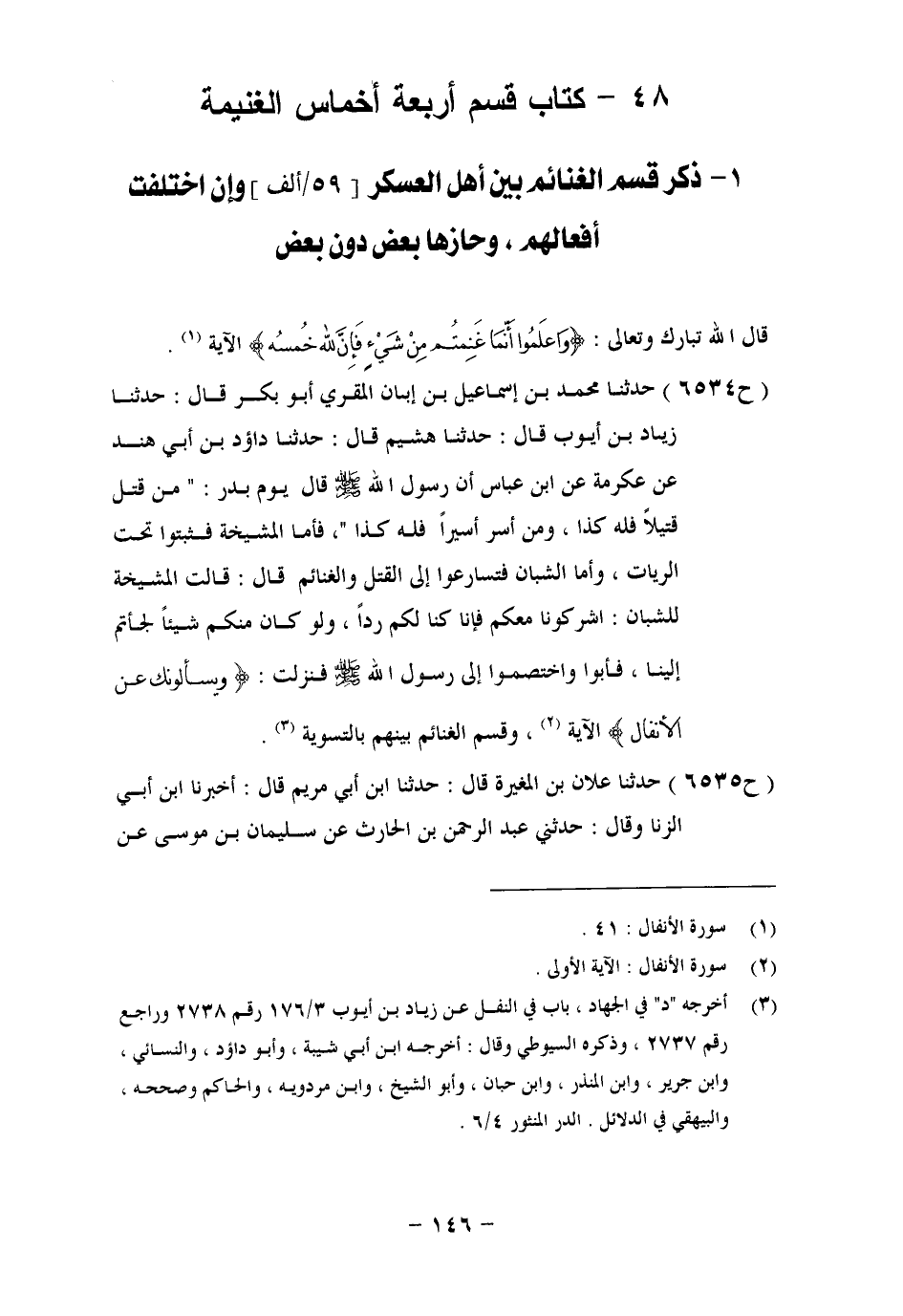 6535 - حَدَّثَنَا عَلَّانُ بْنُ الْمُغِيرَةِ، قَالَ: حَدَّثَنَا ابْنُ أَبِي مَرْيَمَ، قَالَ: أَخْبَرَنَا ابْنُ أَبِي الزِّنَادِ، وَقَالَ،: حَدَّثَنِي عَبْدُ الرَّحْمَنِ بْنُ الْحَارِثِ، عَنْ سُلَيْمَانَ بْنِ مُوسَى، عَنْ -[147]- مَكْحُولٍ، عَنْ أَبِي سَلَّامٍ الْبَاهِلِيِّ، عَنْ أَبِي أُمَامَةَ، عَنْ عُبَادَةَ بْنِ الصَّامِتِ، أَنَّهُ قَالَ: خَرَجَ رَسُولُ اللهِ صَلَّى اللَّهُ عَلَيْهِ وَسَلَّمَ إِلَى بَدْرٍ، فَلَقِيَ الْعَدُوَّ، فَلَمَّا هَزَمَهُمُ اللهُ اتَّبَعْتُهُمْ طَائِفَةٌ مِنَ الْمُسْلِمِينَ يَقْتُلُونَهُمْ، وَأَحْدَقَتْ طَائِفَةٌ رَسُولَ اللهِ صَلَّى اللَّهُ عَلَيْهِ وَسَلَّمَ، وَاسْتَوْلَتْ طَائِفَةٌ يَعْنِي بِالْعَسْكَرِ وَالنَّهْبِ، فَلَمَّا أَنْفَا اللهُ الْعَدُوَّ، وَرَجَعَ الَّذِينَ طَلَبُوهُمْ، قَالُوا: لَنَا النَّفَلُ نَحْنُ طَلَبْنَا الْعَدُوَّ، وَبِنَا نَفَاهُمُ اللهُ وَهَرَّبَهُمْ، وَقَالَ الَّذِينَ أَحْدَقُوا بِرَسُولِ اللهِ صَلَّى اللَّهُ عَلَيْهِ وَسَلَّمَ: مَا أَنْتُمْ بِأَحَقَّ مِنَّا، بَلْ هُوَ لَنَا نَحْنُ أَحْدَقْنَا بِرَسُولِ اللهِ صَلَّى اللَّهُ عَلَيْهِ وَسَلَّمَ لَا يَنَالُ الْعَدُوُّ مِنْ غِرَّةٍ، وَقَالَ الَّذِينَ اسْتَوْلَوْا عَلَى الْعَسْكَرِ وَالنَّهْبِ: وَاللهِ مَا أَنْتُمْ بِأَحَقَّ مِنَّا، نَحْنُ حَوَيْنَاهُ، وَاسْتَوْلَيْنَا عَلَيْهِ، فَأَنْزَلَ اللهُ: {يَسْأَلُونَكَ عَنِ الْأَنْفَالِ} [الأَنْفَالِ: 1] ، قُلِ الْأَنْفَالُ لِلَّهِ وَالرَّسُولِ فَاتَّقُوا اللهَ وَأَصْلِحُوا ذَاتَ بَيْنِكُمْ وَأَطِيعُوا اللهَ وَرَسُولَهُ إِنْ كُنْتُمْ مُؤْمِنِينَ الْآيَةَ قَسَمَهُ رَسُولُ اللهِ صَلَّى اللَّهُ عَلَيْهِ وَسَلَّمَ بَيْنَهُمْ عَنْ فُوَاقٍ قَالَ: وَكَانَ رَسُولُ اللهِ صَلَّى اللَّهُ عَلَيْهِ وَسَلَّمَ يُنَفِّلُهُمْ إِذَا خَرَجُوا نَاوِينَ الرُّبُعَ، وَيُنَفِّلُهُمْ إِذَا قَفَلُوا الثُّلُثَ قَالَ: وَأَخَذَ رَسُولُ اللهِ صَلَّى اللَّهُ عَلَيْهِ وَسَلَّمَ يَوْمَ حُنَيْنٍ وَبَرَةً مِنْ جَنْبِ بَعِيرٍ ثُمَّ قَالَ: «يَا أَيُّهَا النَّاسُ إِنَّهُ لَا يَحِلُّ لِي مِمَّا أَفَاءَ اللهُ عَلَيْكُمْ إِلَّا الْخُمُسُ، وَالْخُمُسُ مَرْدُودٌ عَلَيْكُمْ، فَأَدُّوا الْخِيَاطَ، وَالْمَخِيطَ، وَإِيَّاكُمْ وَالْغُلُولَ، فَإِنَّهُ عَارٌ عَلَى أَهْلِهِ يَوْمَ الْقِيَامَةِ»
